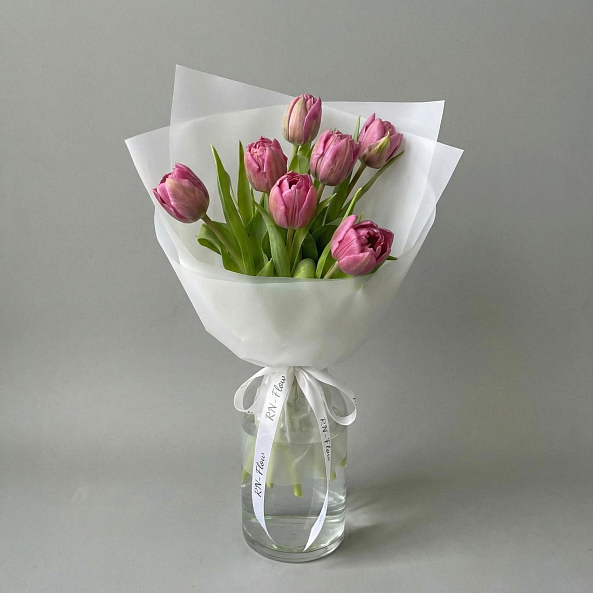 Этот изысканный букет из 7 розовых тюльпанов — воплощение нежности и романтики, словно застывший волшебный рассвет. Каждый лепесток, с его плавным переходом от нежно-розового к фиолетовому, дарит ощущение тепла и уюта, а гладкая текстура подчеркивает изысканность и современный стиль. Плотно собранные в компактную композицию, тюльпаны создают образ минималистичной роскоши, который завораживает своей простотой и элегантностью. Упакованный в прозрачную кальку с атласной лентой «RN-Flow», букет выглядит лаконично и стильно, идеально дополняя как повседневный образ, так и особый момент.