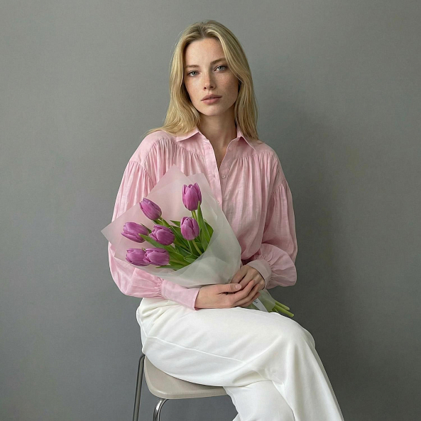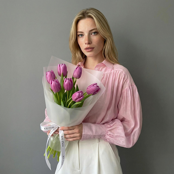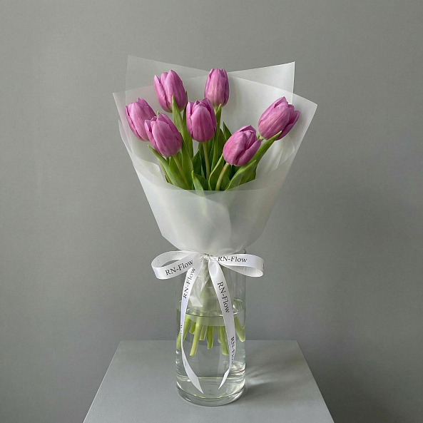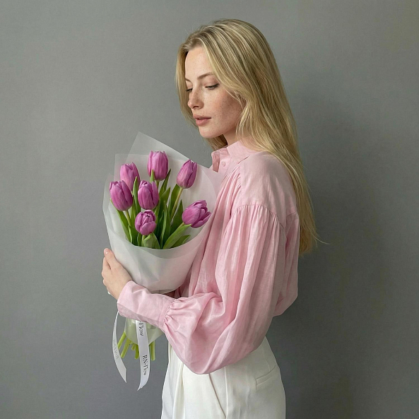 Этот изысканный букет из 7 крупных темно розовых гладких тюльпанов — воплощение нежной роскоши, словно застывший волшебный рассвет в пастельных тонах. Каждый лепесток, с его идеально гладкой текстурой и насыщенным розовым оттенком, напоминает живую драгоценность, а мощные стебли подчеркивают их элегантную силу. Плотно собранные в компактную композицию, тюльпаны создают образ минималистичной гармонии, который завораживает своей простотой и глубиной. Упакованный в белую кальку с атласной лентой «RN-Flow», букет выглядит лаконично и стильно, идеально дополняя как повседневный образ, так и особый момент.