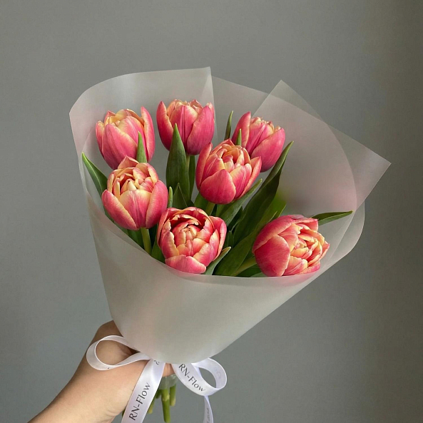 Этот изысканный букет из 7 розово-желтых пионовидных тюльпанов — словно застывший волшебный закат, где нежные оттенки розового и теплые акценты желтого сливаются в одну гармоничную симфонию. Каждый бутон, с его пышной текстурой и плавным переходом цвета, напоминает о первых лучах утреннего солнца, а аккуратные зеленые стебли придают композиции естественную свежесть. Упакованный в прозрачную кальку с атласной лентой «RN-Flow», букет выглядит лаконично и стильно, идеально дополняя как романтический образ, так и минималистичный интерьер.