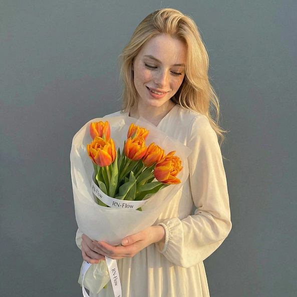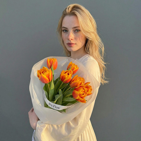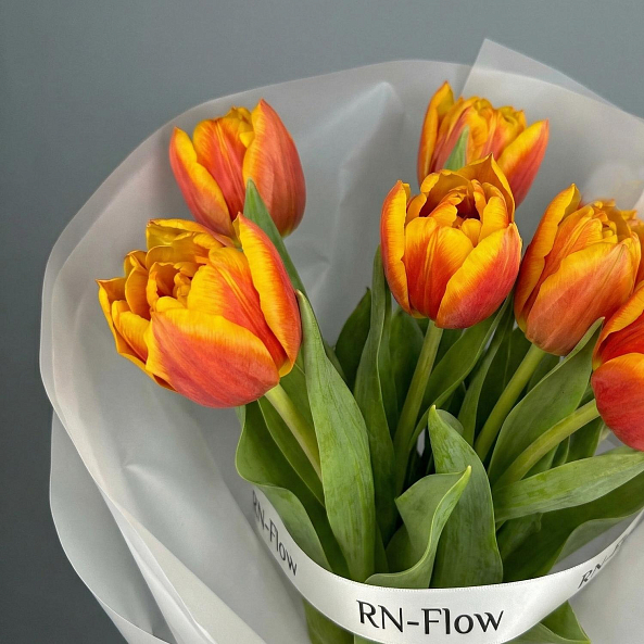 Этот букет — взрыв тепла и энергии, где насыщенные оранжевые тюльпаны, словно живые всполохи заката, дарят ощущение уюта и вдохновения. Каждый бутон, с его ярким градиентом от глубокого апельсинового к золотистому, символизирует страсть и оптимизм, а зеленые стебли придают композиции естественную свежесть. Упакованный в прозрачную кальку с элегантной лентой «RN-Flow», букет выглядит современно и стильно, идеально дополняя как романтический образ, так и повседневный образ.