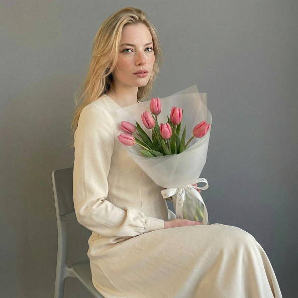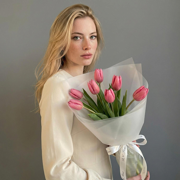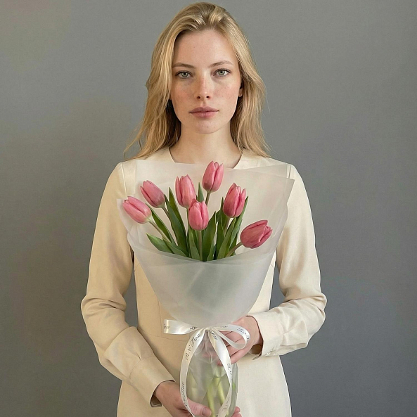 Этот букет — нежный шёпот весны, где розовые тюльпаны с плавным переходом от кремового к нежно-розовому создают ощущение уюта и романтики. Каждый бутон, словно окутанный утренним туманом, дарит изысканную плавность, а длинные зеленые стебли подчеркивают естественную грацию композиции. Упакованный в прозрачную кальку с элегантной лентой «RN-Flow», букет выглядит минималистично и современно, идеально дополняя как повседневный образ, так и особый момент.