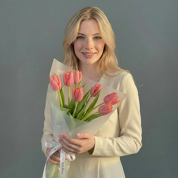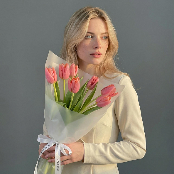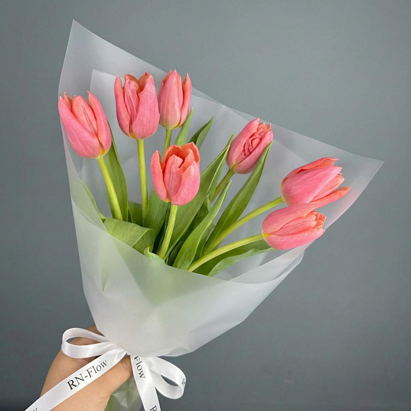 Этот букет — нежное послание, где розовые тюльпаны, словно утренние лучи, дарят ощущение свежести и тепла. Каждый бутон, с его идеально сформированным лепестком и нежным оттенком, символизирует начало чего-то прекрасного, а длинные зеленые стебли придают композиции естественную грацию. Упакованный в прозрачную кальку с элегантной лентой «RN-Flow», букет выглядит минималистично и современно, идеально дополняя любой образ — от романтического до строгого.
