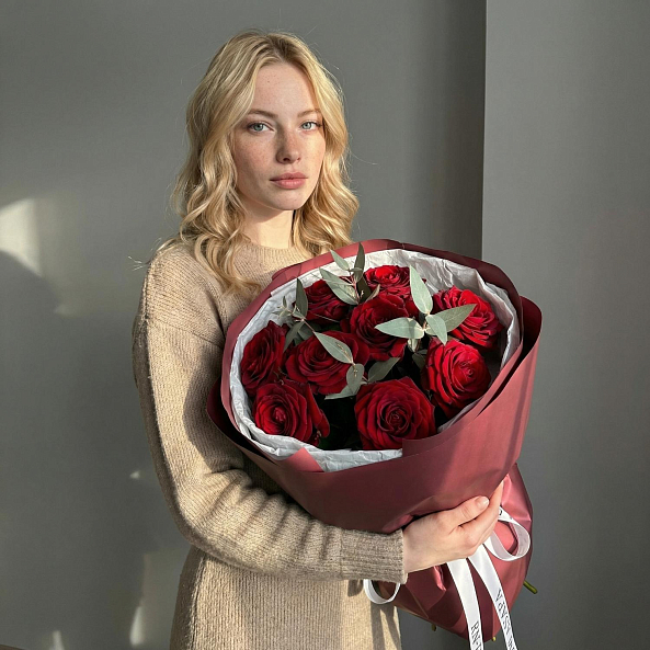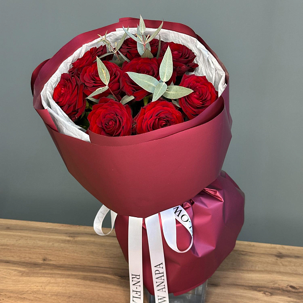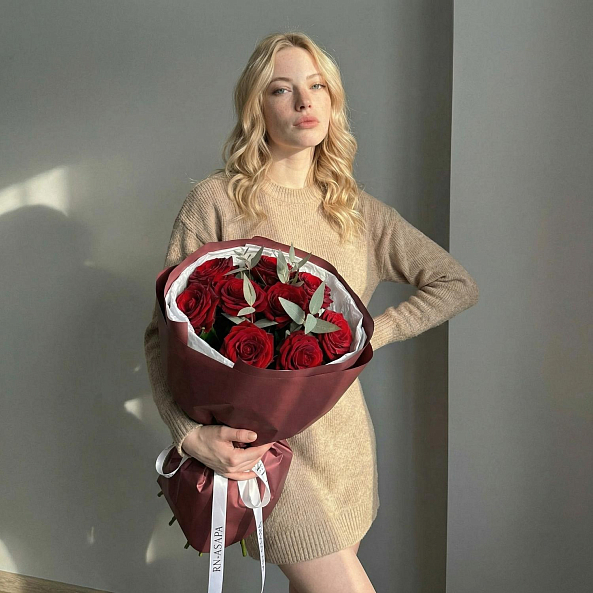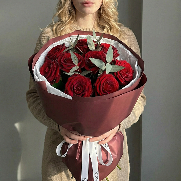9 роз Красных "Ред Наоми" 40 см с эвкалиптом.