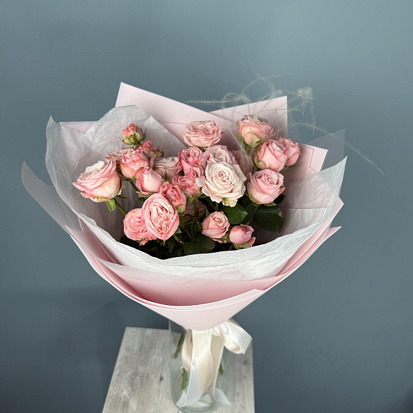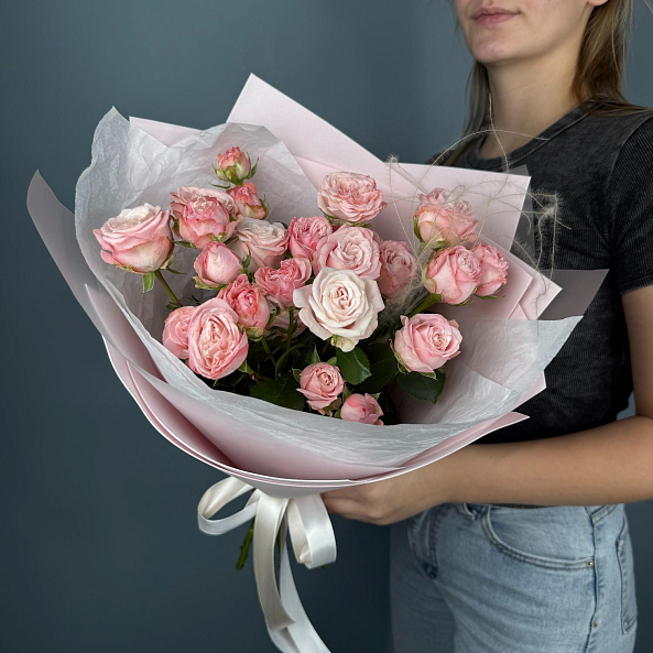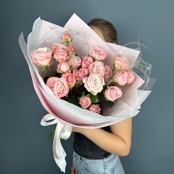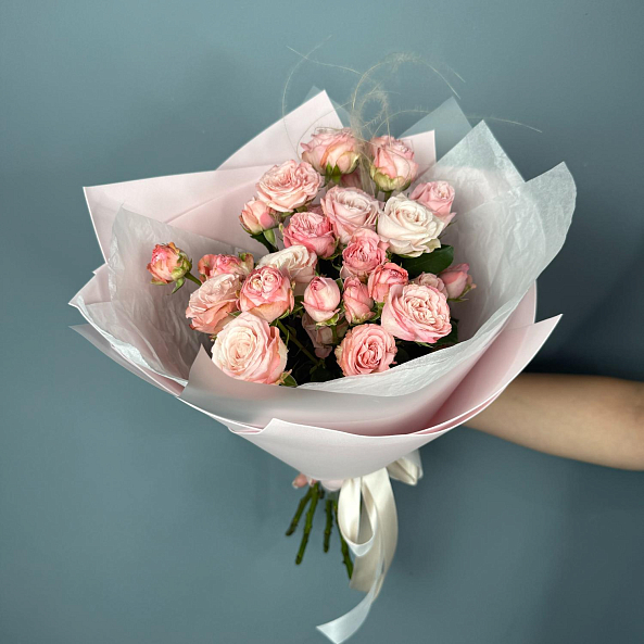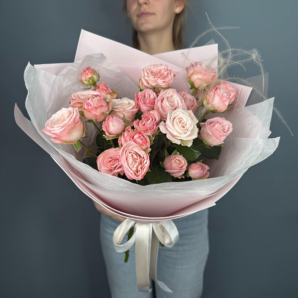 Букет из 9 кустовых пионовидных роз «Мадам Бомбастик» высотой 50 см — нежный, пышный и романтичный. Каждая роза напоминает распустившийся пион с мягким розовым оттенком и бархатистыми лепестками. Лёгкие веточки ковыля добавляют композиции воздушности и природной элегантности. Идеально подойдёт для Дня рождения, Дня святого Валентина, признания в любви или как знак внимания. Упакован в стильную бумагу с лентой — готовый подарок, который тронёт сердце своей нежностью и изысканностью.