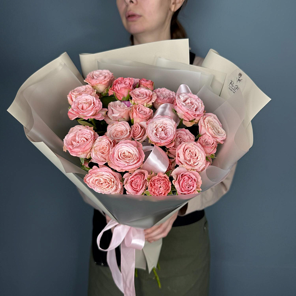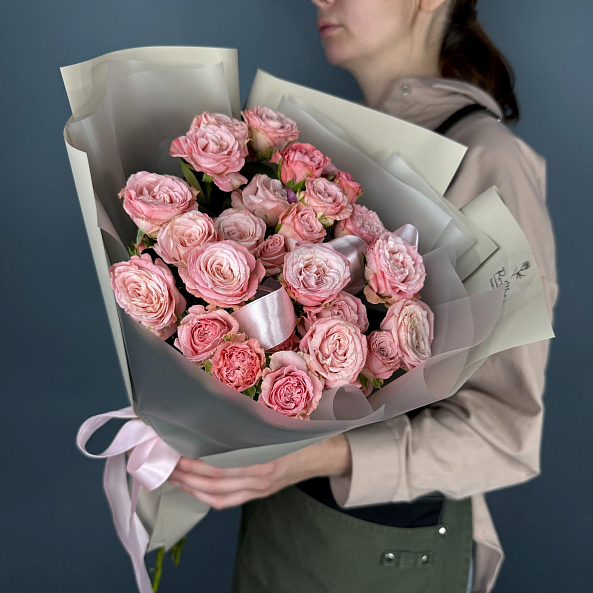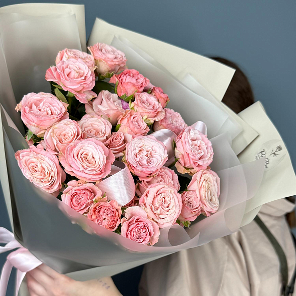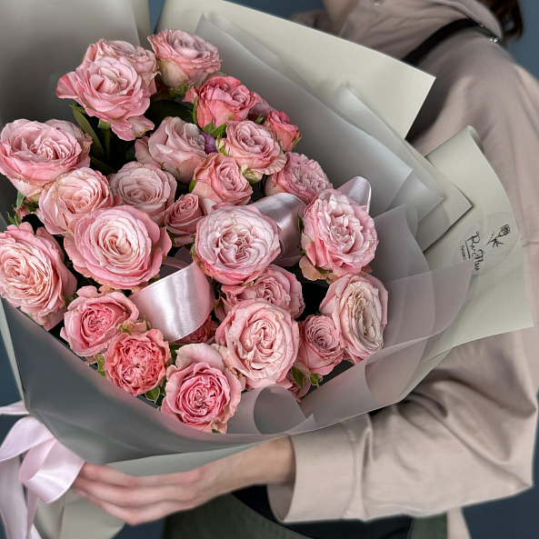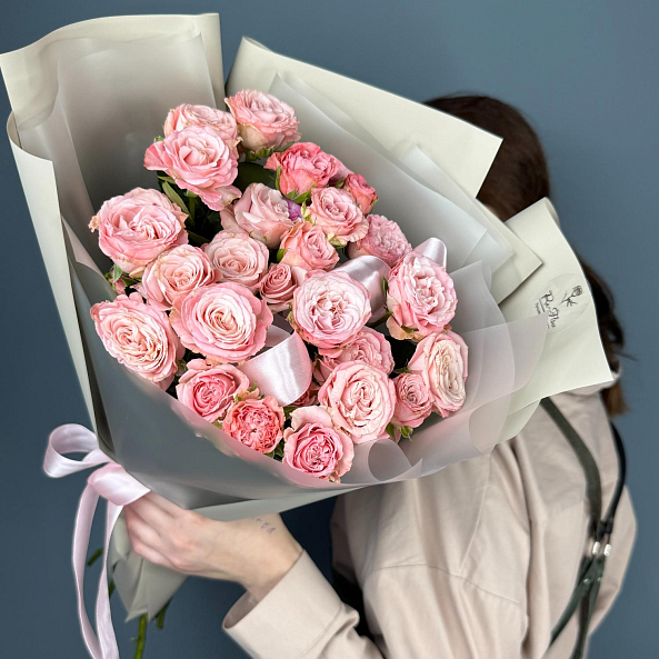 Букет из 9 кустовых пионовидных роз «Мадам Бомбастик» высотой 50 см — нежный, пышный и романтичный. Каждая роза напоминает распустившийся пион с мягким розовым оттенком и бархатистыми лепестками. Лёгкие веточки ковыля добавляют композиции воздушности и природной элегантности. Идеально подойдёт для Дня рождения, Дня святого Валентина, признания в любви или как знак внимания. Упакован в стильную бумагу с лентой — готовый подарок, который тронёт сердце своей нежностью и изысканностью.