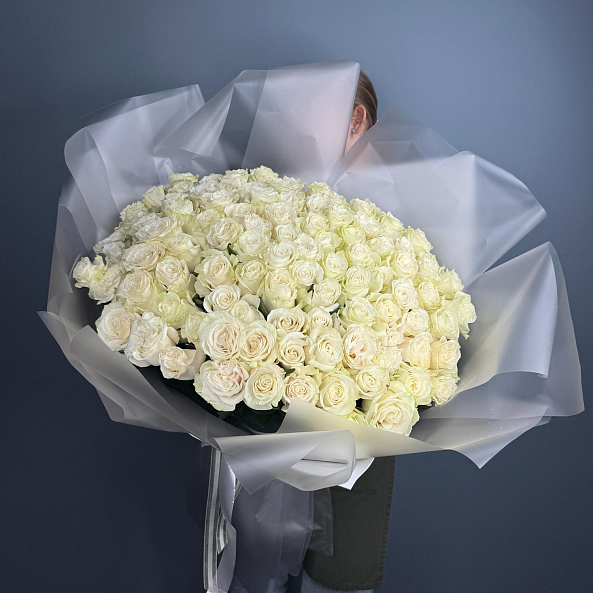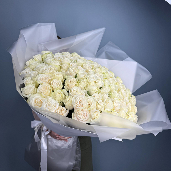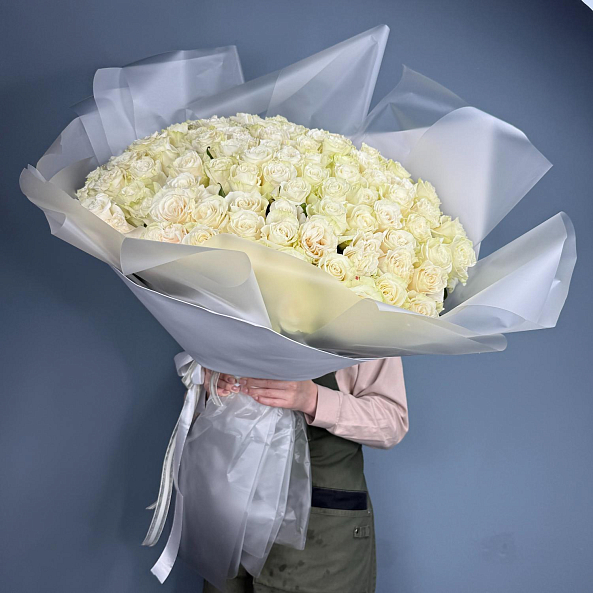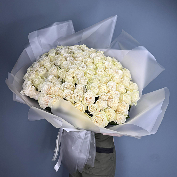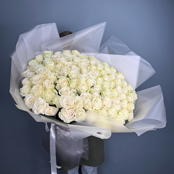 изысканный букет из 101 эквадорской розы сорта Мондиаль белая роза - с зеленой рубашкой. Цветы высотой около 70 см выглядят особенно стильно и благородно, подчеркивая нежность и чистоту. Идеальный выбор для романтических подарков, юбилеев, свиданий и других значимых событий.