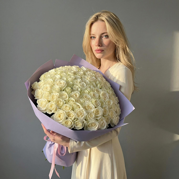 Этот изысканный букет — настоящая симфония чистоты и элегантности, где 101 белая роза в идеальной форме создает объемную и гармоничнуюозицию. Каждый бутон, от нежных лепестков до утонченной формы, словно застывший волшебный момент из свадебной сказки.