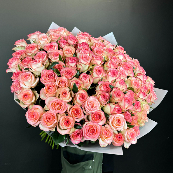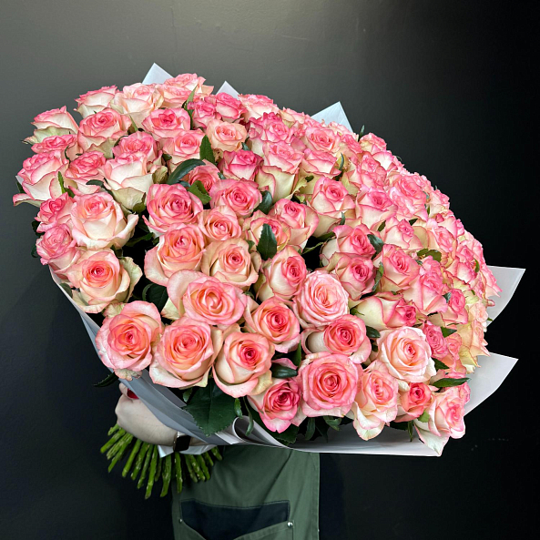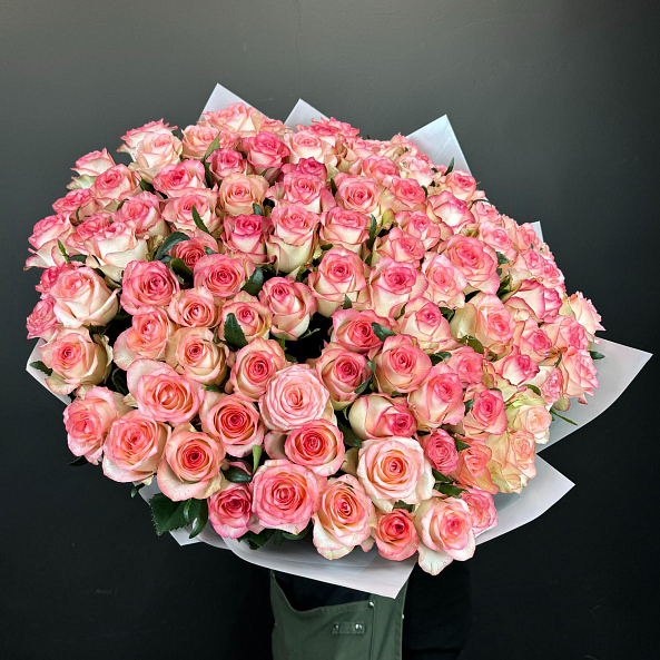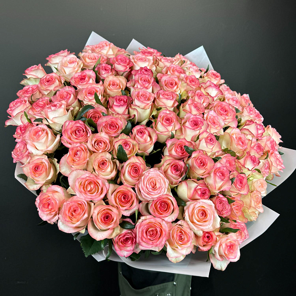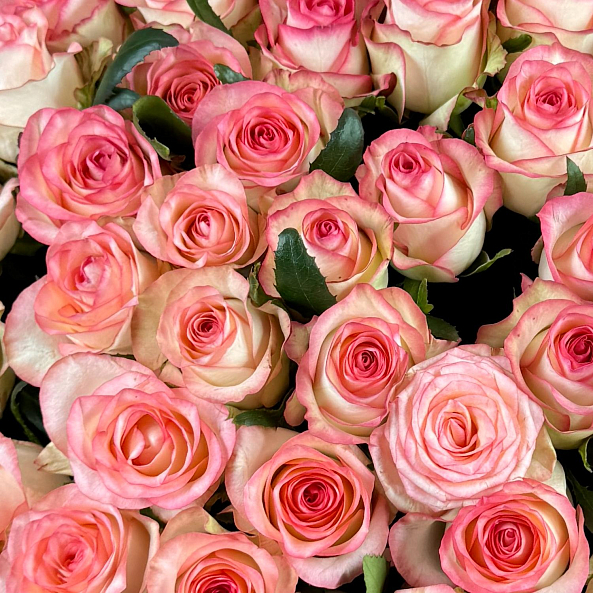 Нежный и романтичный букет из множества роз с персиковым оттенком и розовыми краями лепестков. Идеальный выбор, чтобы передать чувства нежности, восхищения и душевного тепла — подарок, который согреет сердце.