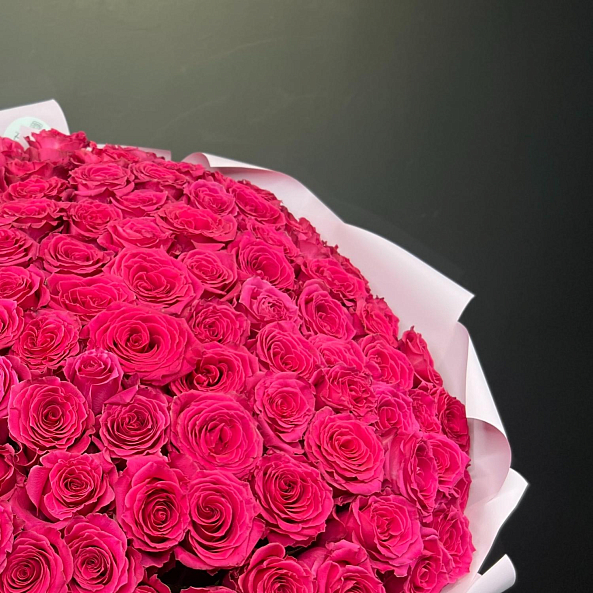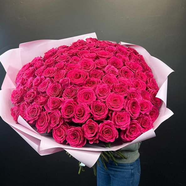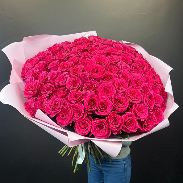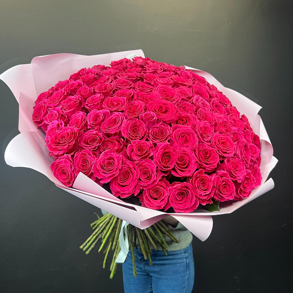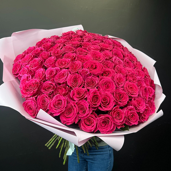 Этот роскошный букет из 101 премиум-розы «Full Monty» — настоящий взрыв нежности и страсти, словно застывший волшебный закат в ярко-розовом оттенке. Каждый бутон, выращенный в Эквадоре, обладает идеальной формой, бархатистыми лепестками и насыщенным цветом, который дарит ощущение тепла и жизненной силы. Стебли длиной 70 см создают объемную композицию, подчеркивающую роскошь и изысканность, а аккуратные зеленые листья придают естественную гармонию. Упакованный в нежно-розовую кальку с лентой «RN-Flow», букет выглядит как произведение искусства — идеально дополняя романтический образ или торжественное мероприятие.