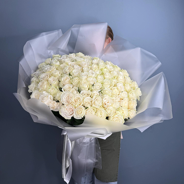 изысканный букет из 101 эквадорской розы сорта Мондиаль в белом цвете с зеленой рубашкой. Цветы высотой около 70 см выглядят особенно стильно и благородно, подчеркивая нежность и чистоту. Идеальный выбор для романтических подарков, юбилеев, свиданий и других значимых событий.