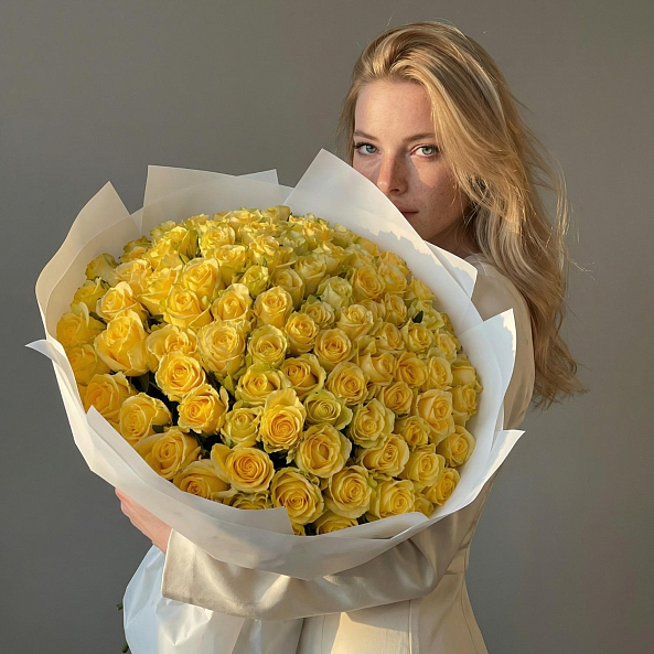 101 яркая желтая роза «Пени Лейн» — это не просто букет, а признание в чувствах без слов. Идеален для тех, кто хочет подарить не просто цветы, а целое настроение.