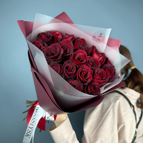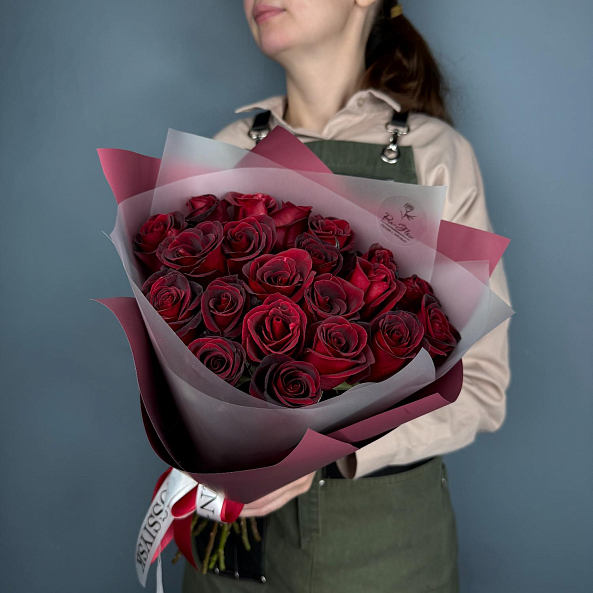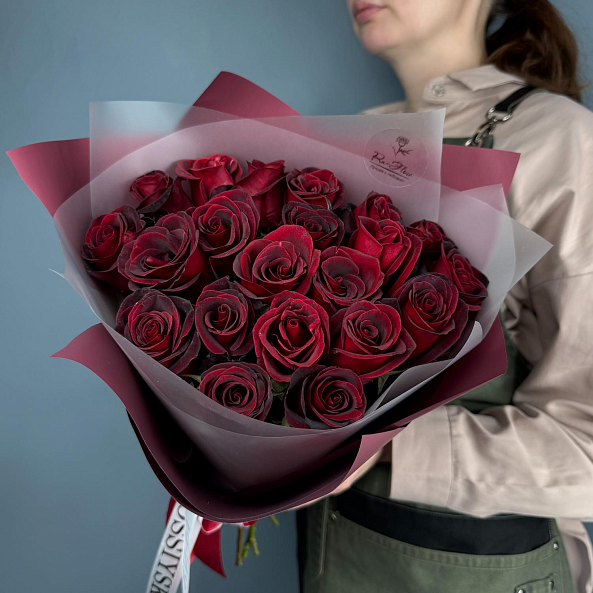 А) 21 роза "Черная Магия" 40 см — это гламурный и загадочный букет, наполненный таинственностью и стилем. Темно-бордовые розы с насыщенным цветом и плотными бутонами подчёркивают элегантность и страсть. Такой букет станет потрясающим подарком на годовщину, романтическое свидание, юбилей или как выражение особого восхищения.
