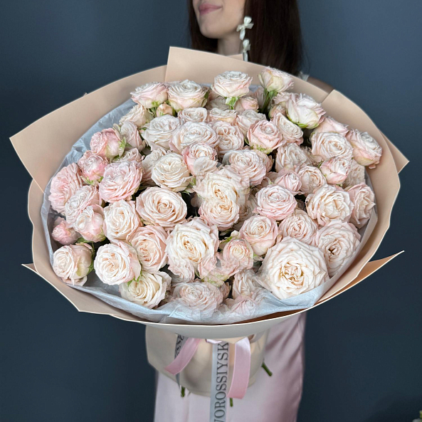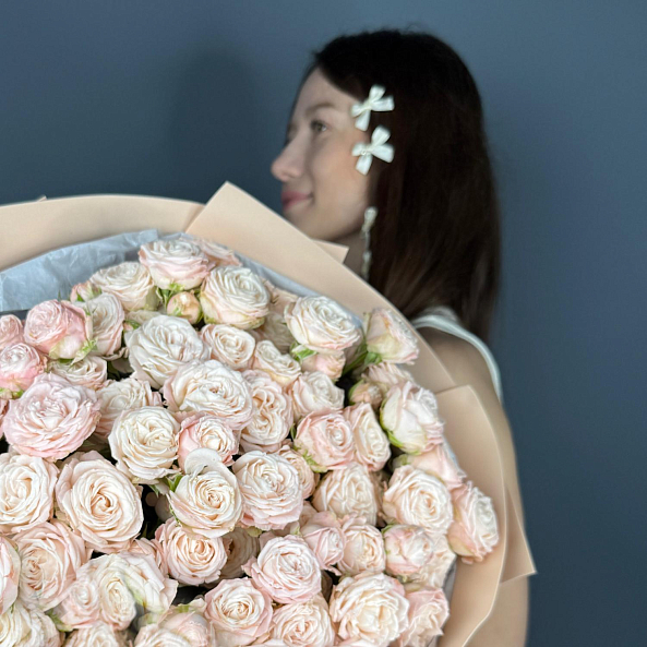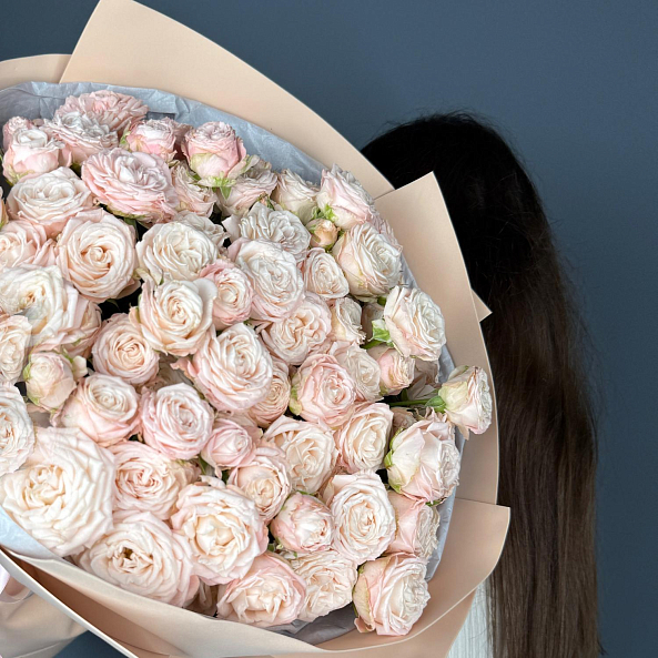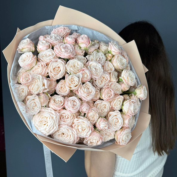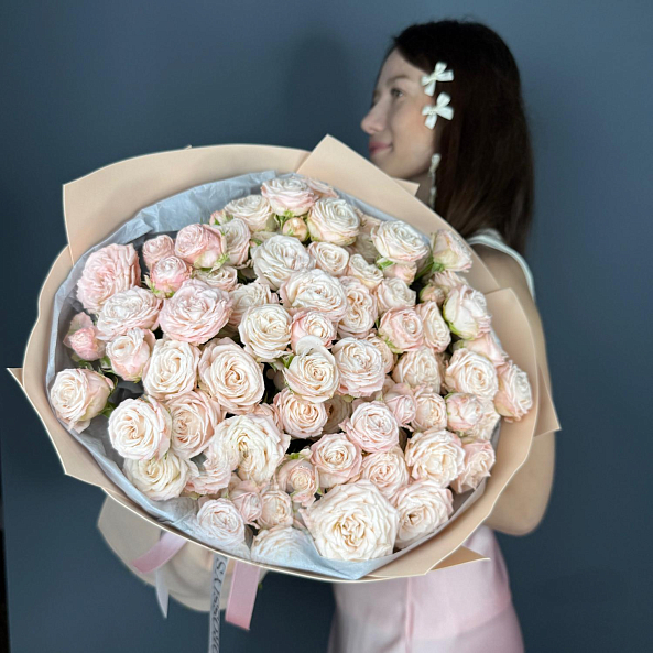 Нежные, пышные бутоны с кремово-розовым отливом, словно раскрывшиеся после утреннего тумана. Идеальный баланс между изысканностью и уютом — для тех, кто ценит тихую красоту. Идеальный подарок на день рождения.