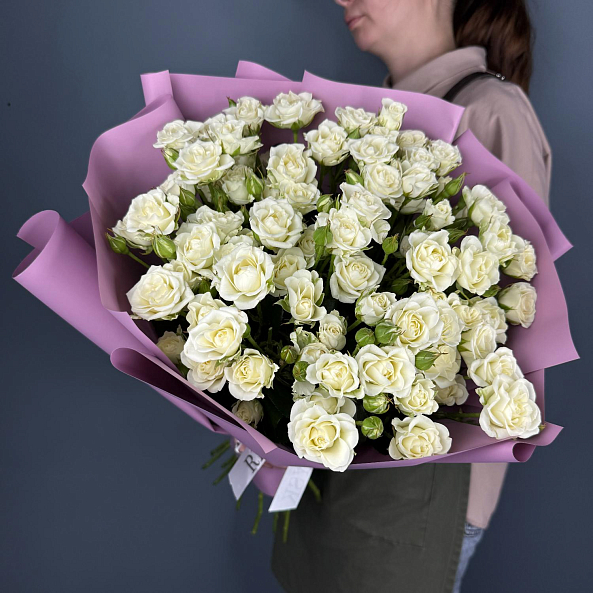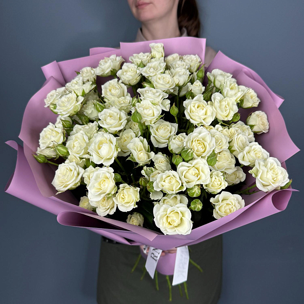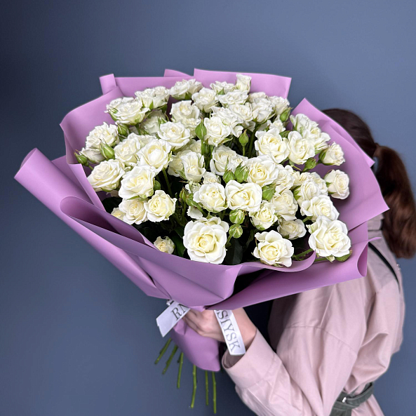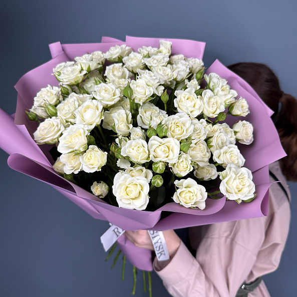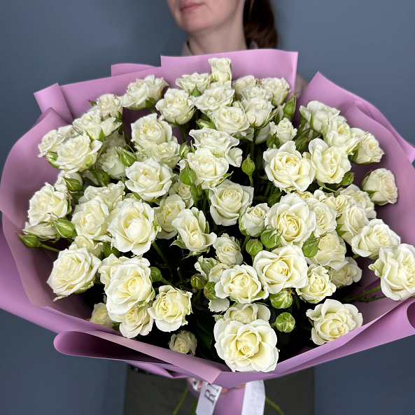Чистый, нежный букет из 21 белоснежной розы с лёгким кремовым отливом. Пышные, многослойные бутоны и свежая зелень создают ощущение уюта и спокойствия. Идеален для свадьбы, дня рождения или просто чтобы сказать: «Ты — мой свет».
