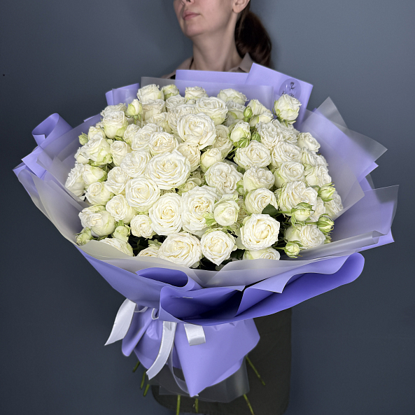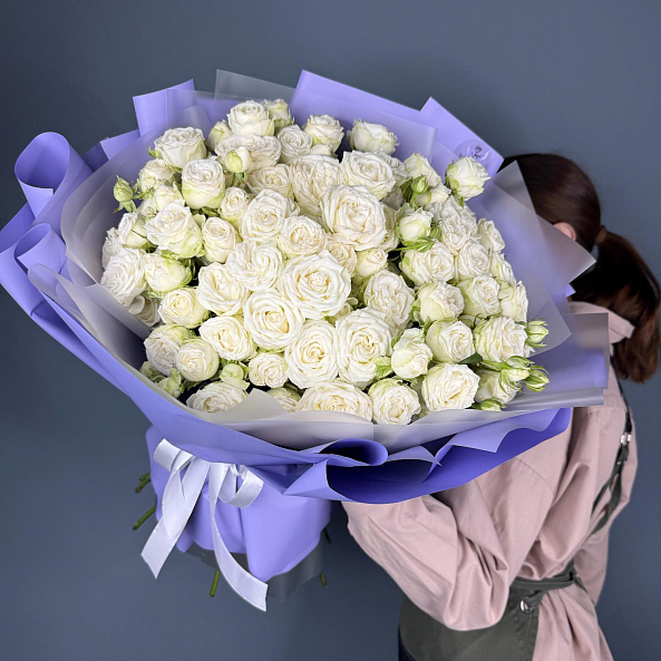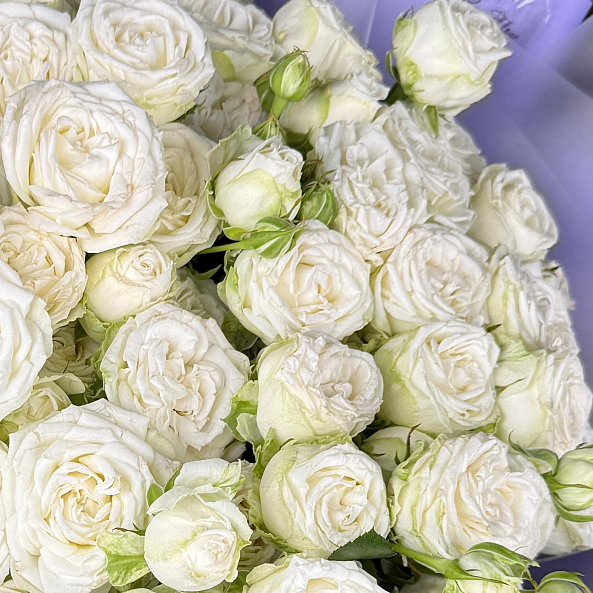 Роскошный, объёмный букет из 21 белоснежной пионовидной кустовой розы с нежным зелёным отливом. Чистота, элегантность и утончённая нежность в каждом бутоне. Идеален для особенного случая — свадьбы, годовщины или просто чтобы сказать: «Ты — моя первая мысль по утрам».