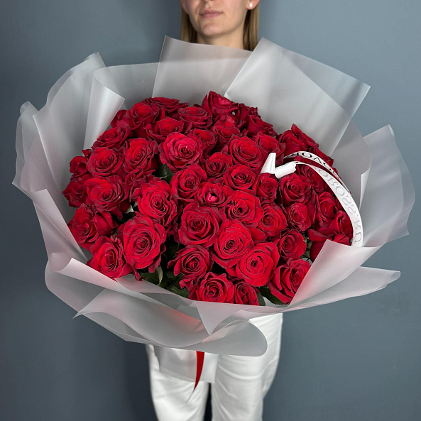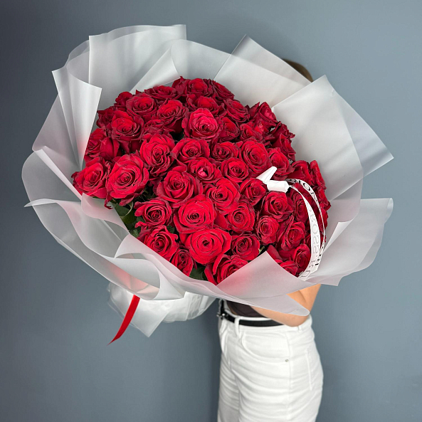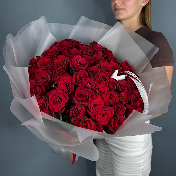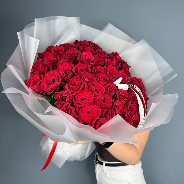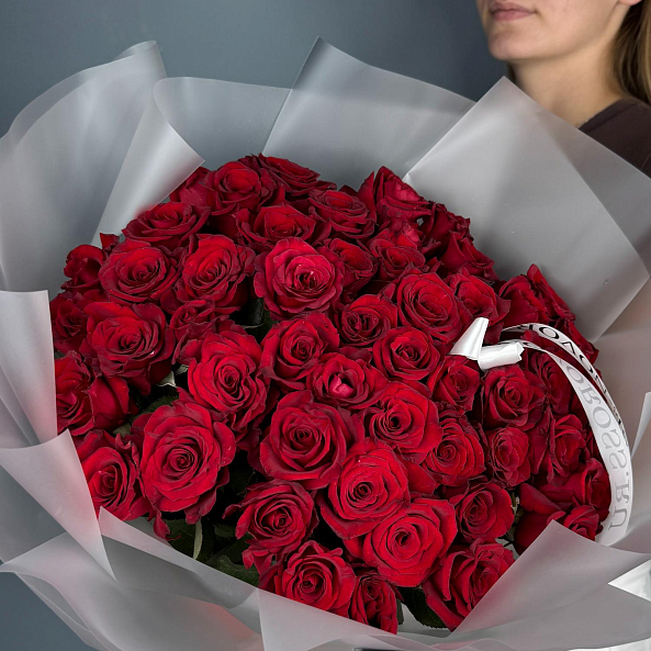 Величественный букет из 51 розы сорта «Чёрная магия» — яркое сочетание глубокой страсти и элегантности. Насыщенный бордовый  оттенок, при недостатке света переходящий в почти чёрный, придаёт цветам загадочность и драматизм. Крупные бутоны и плотные лепестки свидетельствуют о высоком качестве — это классика жанра в премиальном исполнении.