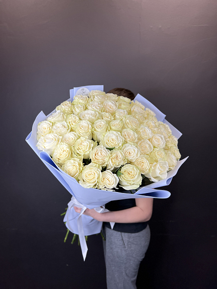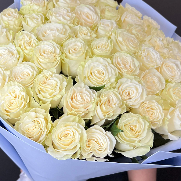 Роскошный букет из множества нежно-белых роз — символ чистоты, изысканности и глубокого уважения. Идеальный выбор для самого важного повода, чтобы поразить своей красотой и великолепием.
