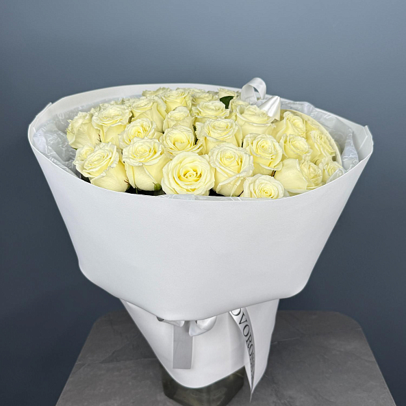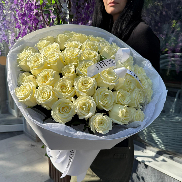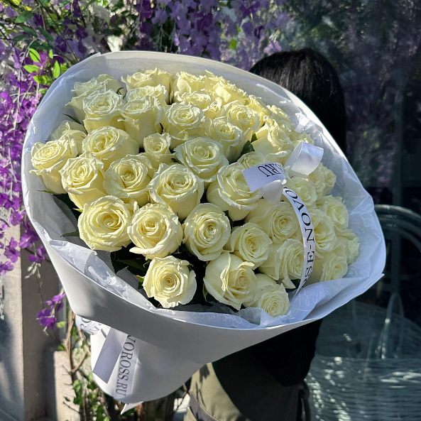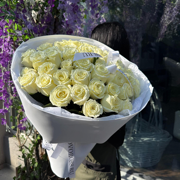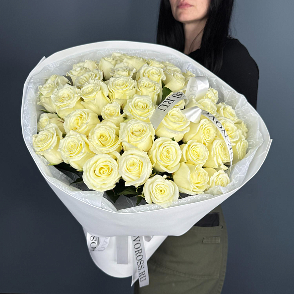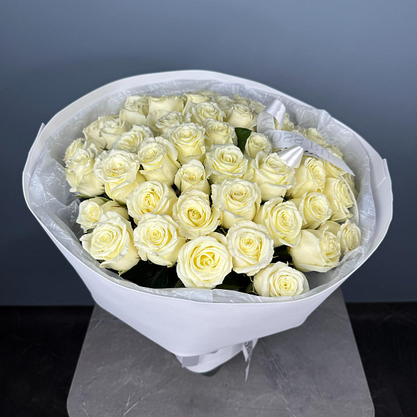Элегантный букет из 51 розы "Вайт Найт" высотой 40 см. Эти белые розы с легким кремовым оттенком обладают резными бутонами и приятным ароматом. Букет создает атмосферу чистоты и изысканности, идеально подходя для выражения глубоких чувств и восхищения.