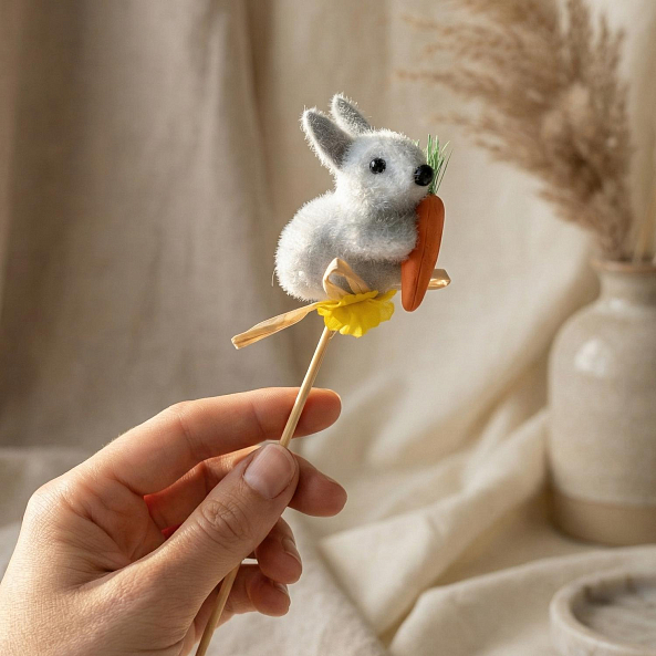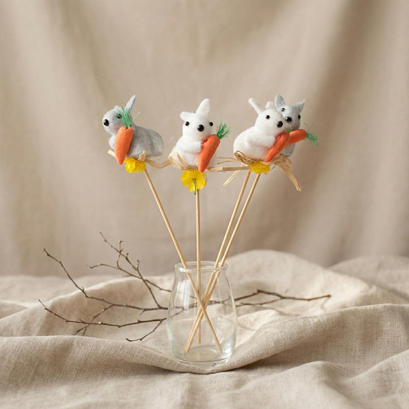 Эта очаровательная декорация — настоящий символ пробуждения весны, где три уникальных зайчика в разных оттенках создают атмосферу тепла и праздника.