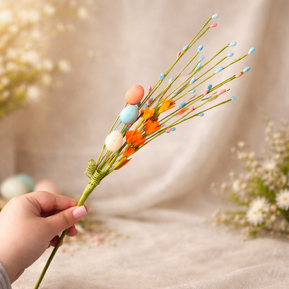Эта очаровательная ветка — настоящий символ пробуждения весны, где нежные пастельные оттенки и декоративные элементы создают атмосферу праздника. Длина 44 см позволяет использовать её как самостоятельный декор или часть композиции: в вазе, на столе или в качестве акцента для фотосессий. Каждая деталь, от ярких пасхальных яиц до нежных цветов, словно застывший волшебный момент из детской сказки.