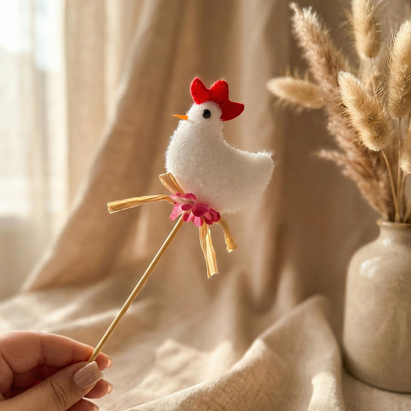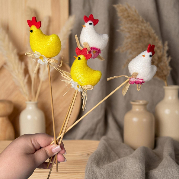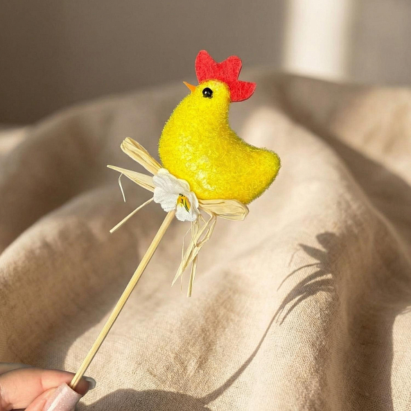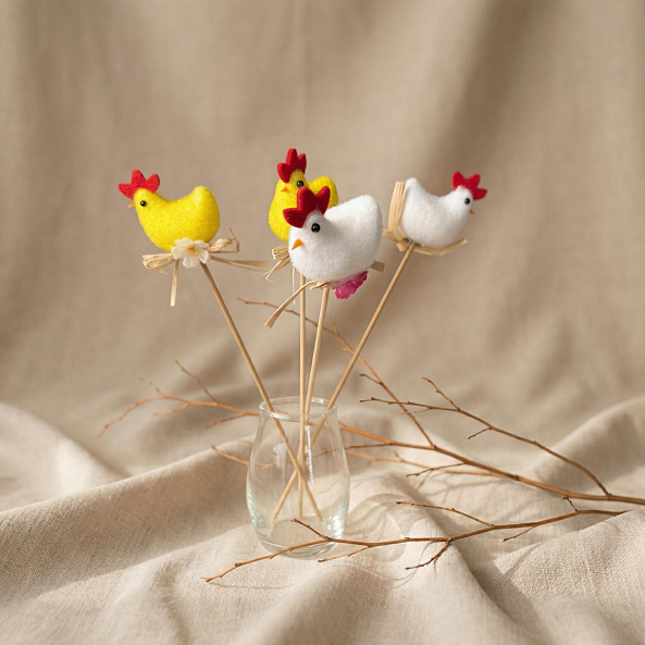 Эта очаровательная декорация — настоящий символ пробуждения весны, где яркие желтые курочки с красными гребешками создают атмосферу тепла и праздника. Каждая курочка, выполненная из натурального войлока вручную, увенчана нежным белым цветком и держится на бамбуковой палочке, словно застывший волшебный момент из детской сказки. Дополненные натуральными ветками и упакованные в прозрачную стеклянную вазу, они станут идеальным акцентом для любого пасхального мероприятия.