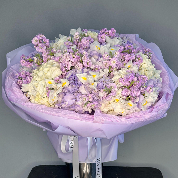 Этот уникальный букет — воплощение изысканной гармонии, где пышные гортензии в оттенках лаванды и белого создают объем и воздушность, а белые ирисы добавляют элегантную строгость и нежную деликатность. Маттиола лавандовая, с её мелкими соцветиями и тонким ароматом, завершает композицию, превращая её в живую симфонию природы. Каждый цветок, словно созданный для того, чтобы передать ваши чувства, упакован в нежную фиолетовую кальку с атласной лентой «RN-Flow», подчеркивая авторский шарм и внимание к деталям.