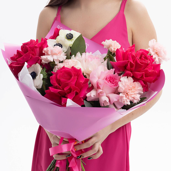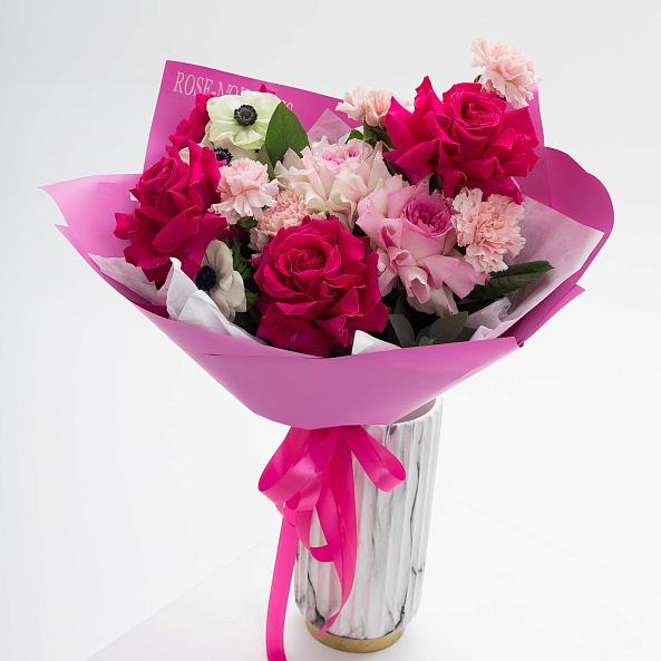 Погрузитесь в мир неистовой нежности с этим смелым букетом, где бархатистые бордово-розовые розы, яркие красные анемоны и нежные светло-розовые гвоздики сливаются в гармоничную симфонию, напоминающую закат, окутанный пламенем чувств. Каждый лепесток, от глубокого бордового до нежного персикового, дышит страстью и элегантностью, а свежая зелень листьев придает композиции баланс и естественность. Букет упакован в розовую бумагу с надписью «ROSE-NOVOROSS», превращая его в не просто подарок, а живое послание, которое останется в памяти навсегда.