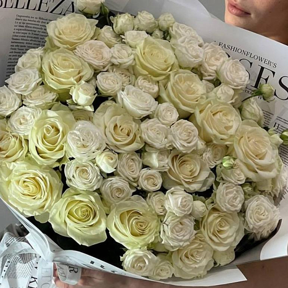 Букет Гигант. Кустовая Пионовидная Белая Роза "Вайт Пиони", Роза Эквадор Премиум "Мондиаль"