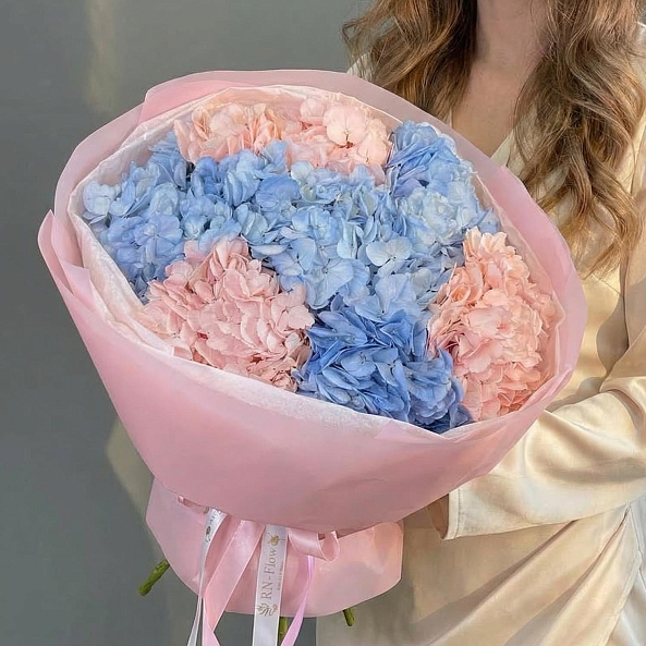 Этот изысканный букет из 7 гортензий — нежное слияние голубых и нежно-розовых соцветий, словно застывший волшебный закат над океаном. Каждое соцветие, с его объемной текстурой и плавным переходом от прохладного голубого к теплому розовому, дарит ощущение спокойствия и романтики, а аккуратные зеленые стебли придают композиции естественную гармонию. Упакованный в розовую кальку с атласной лентой «RN-Flow», букет выглядит лаконично и стильно, идеально дополняя как повседневный образ, так и особый момент.