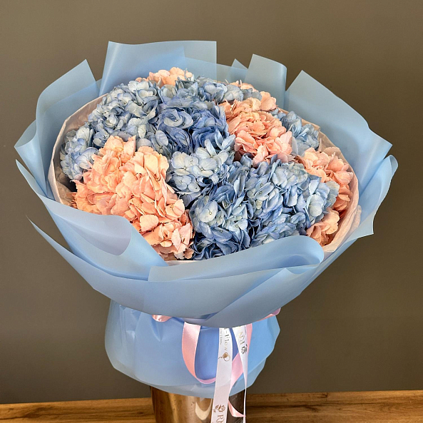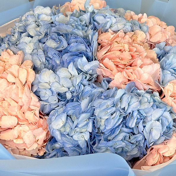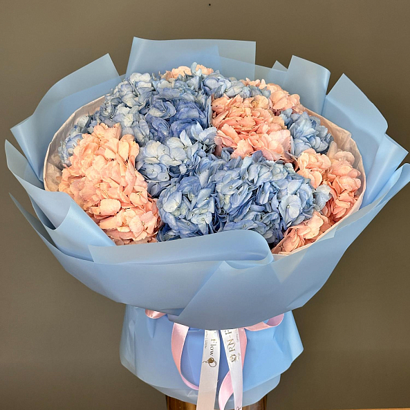 Этот изысканный букет из 11 гортензий — нежное переплетение голубых и нежно-розовых соцветий, словно застывший волшебный рассвет. Каждое соцветие, с его объемной текстурой и плавным переходом от прохладного голубого к теплому розовому, дарит ощущение спокойствия и романтики, а аккуратные зеленые стебли придают композиции естественную гармонию. Упакованный в светло-голубую кальку с атласной лентой «RN-Flow», букет выглядит лаконично и стильно, идеально дополняя как повседневный образ, так и особый момент.