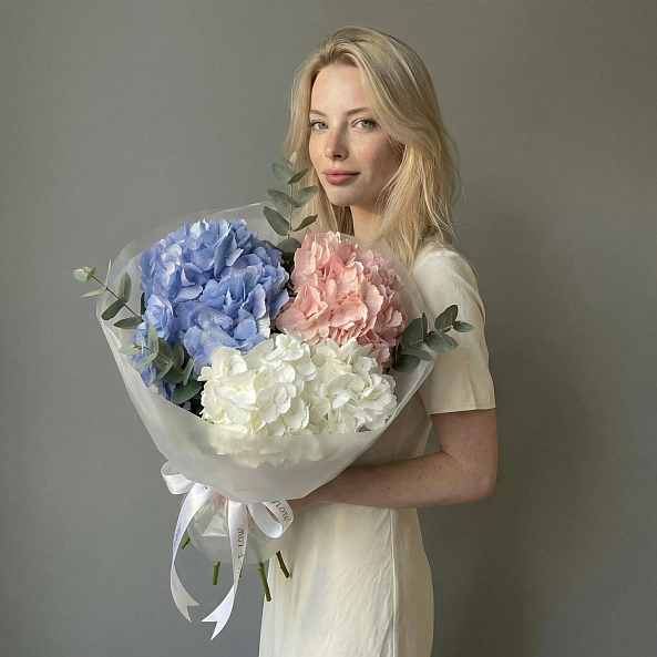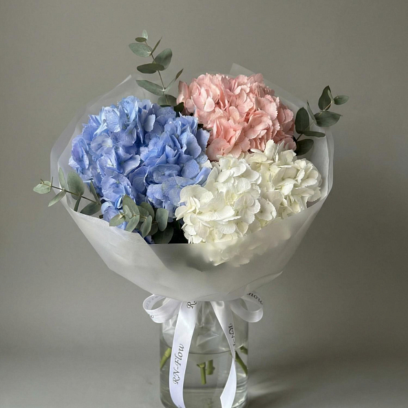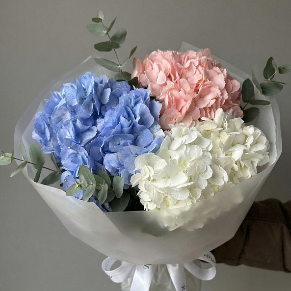 Погрузитесь в мир изысканной гармонии с этим уникальным букетом, где нежные гортензии в оттенках лазурного, персикового и чистого белого сливаются в живописную композицию, дополненную свежими веточками эвкалипта. Каждый цветок, словно капля утренней росы, передает спокойствие и изысканность, а аккуратная упаковка в прозрачную бумагу с лентой «RN-Flow» подчеркивает естественную красоту букета, превращая его в живое послание: «Ты — мой самый гармоничный момент».
