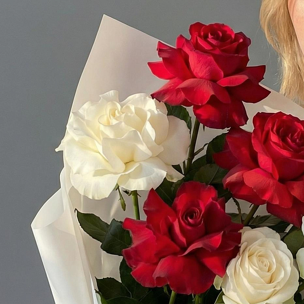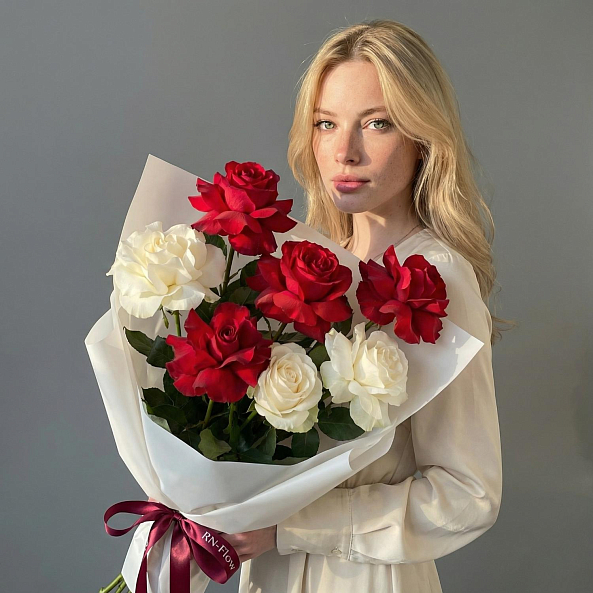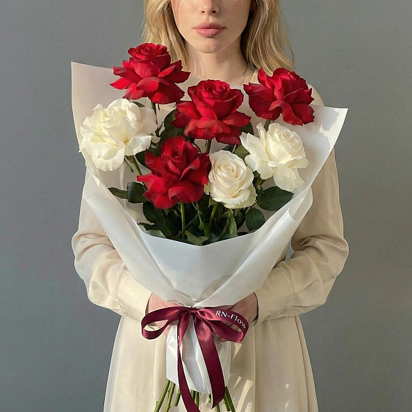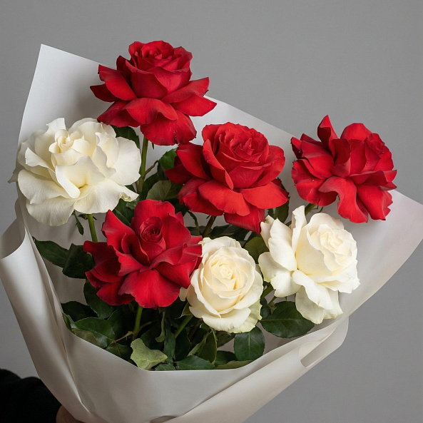Погрузитесь в мир гармонии с этим изысканным букетом, где яркие алые розы символизируют глубокую страсть, а нежные белые розы дарят ощущение чистоты и вечности. Каждый лепесток, словно вспышка чувств, создает контраст, который превращает букет в живое послание: «Ты — мой самый яркий и светлый момент». Аккуратная упаковка в белую бумагу и лента с логотипом «RN-Flow» подчеркивают элегантность композиции, делая её готовой к презентации без лишних деталей.