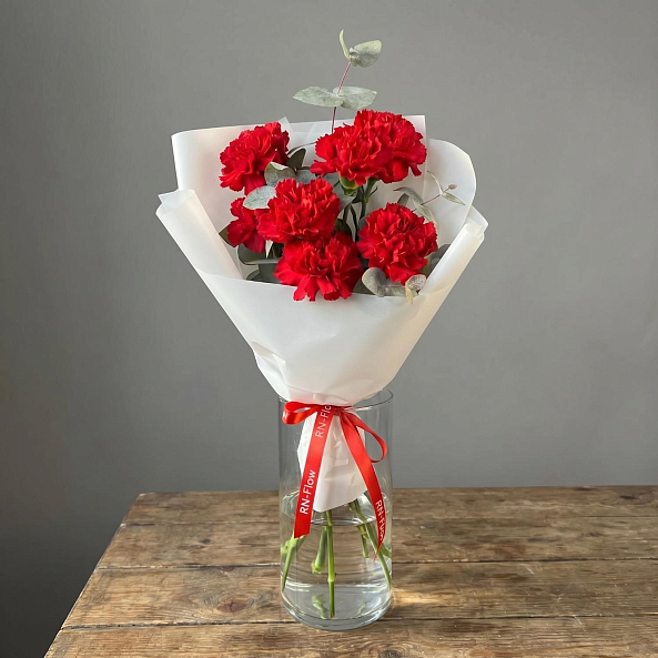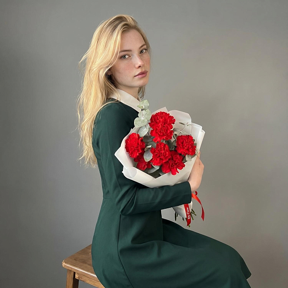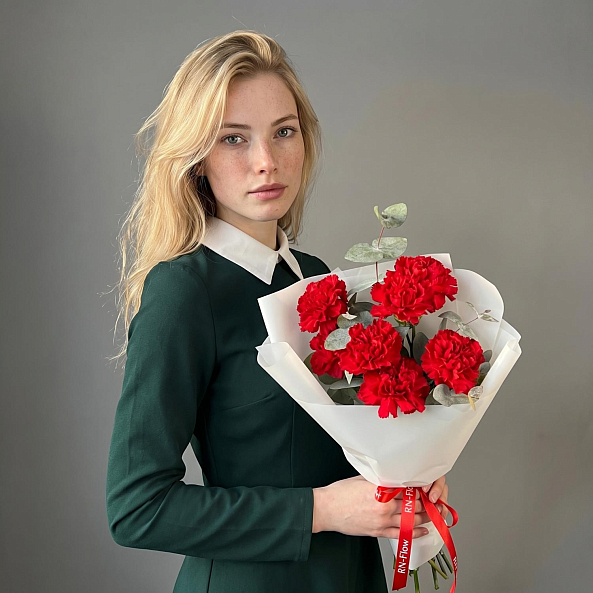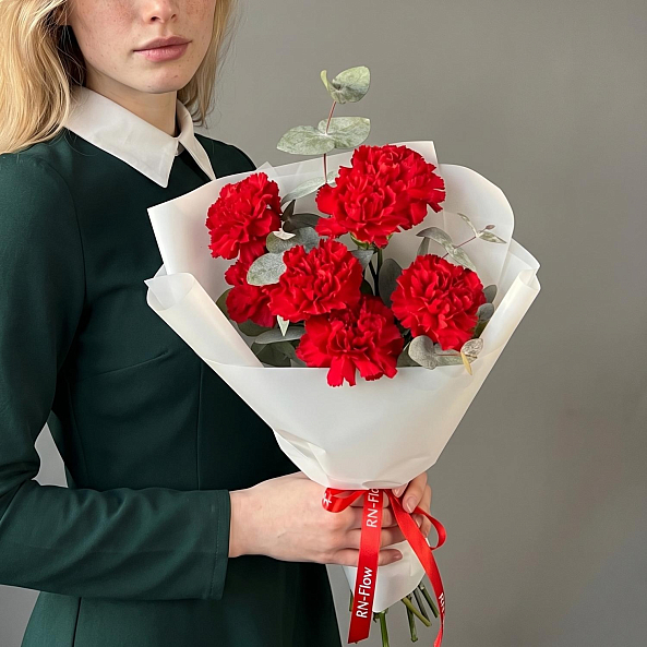 Этот изысканный букет — настоящая симфония уважения и нежности, где 7 ярких красных гвоздик сливаются с нежными ветками эвкалипта, создавая гармоничную композицию, словно застывший момент из самой теплой сказки. Каждый цветок, от насыщенного бархатистого оттенка гвоздик до свежих зеленых листьев эвкалипта, дарит ощущение глубины чувств и искренности. Упакованный в прозрачную кальку с красной атласной лентой «RN-Flow», букет выглядит лаконично и стильно, идеально дополняя как повседневный образ, так и особый момент.