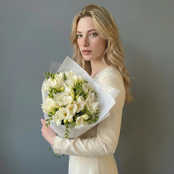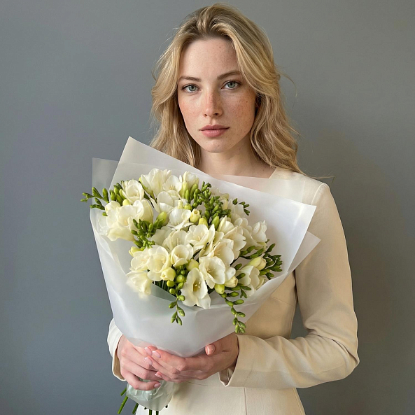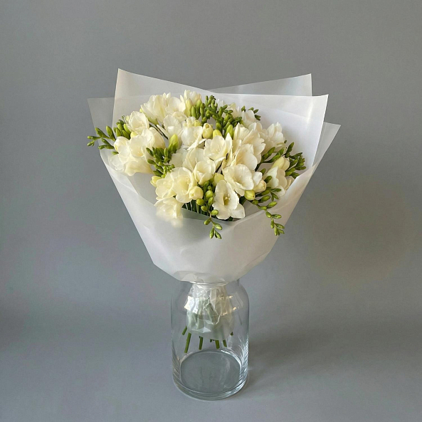 Погрузитесь в мир изысканной элегантности с этим букетом белых фрезий, чьи нежные лепестки, словно снежные хлопья, излучают чистоту и нежность. Каждый цветок, с его изысканной формой и нежным ароматом, создает атмосферу спокойствия и утонченной красоты, а свежие зеленые стебли и бутоны добавляют композиции живости и природной гармонии. Аккуратная упаковка в белую бумагу подчеркивает естественную грацию фрезий, превращая букет в настоящее произведение искусства.
