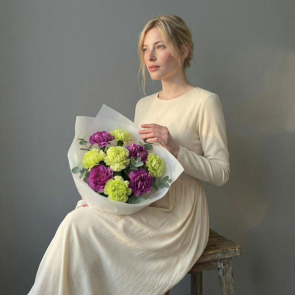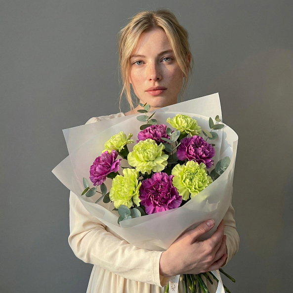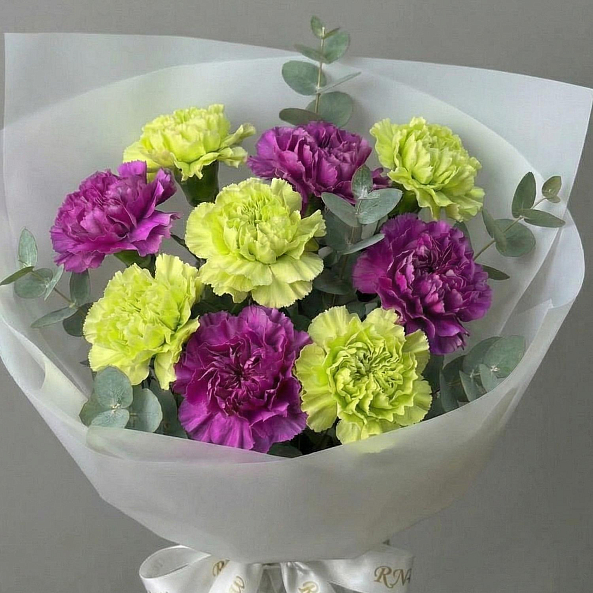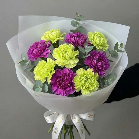 Погрузитесь в мир ярких контрастов с этим уникальным букетом, где насыщенные фиолетовые гвоздики гармонично сочетаются с нежными лаймовыми гвоздиками в изысканной композиции. Каждый цветок, словно вспышка весеннего солнца, создает игру оттенков, а листья эвкалипта добавляют текстуру и ароматную глубину. Упакованный в элегантную белую бумагу и украшенный лентой с логотипом «RN-Flow», этот букет становится живым символом страсти и обновления, идеальным для тех, кто ценит необычные решения.