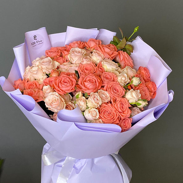 Этот изысканный букет из 21 кустовой розы сортов «Барбадос» и «Полина» — настоящая симфония нежности и гармонии, словно застывший волшебный рассвет в персиково-кремовых тонах. Каждый бутон, от насыщенных персиково-розовых оттенков «Барбадос» до нежно-кремовых лепестков «Полина», дарит ощущение тепла и уюта, а компактная высота 40 см создает изящную композицию, которая завораживает своей простотой и элегантностью. Упакованный в фиолетовую кальку с атласной лентой «RN-Flow», букет выглядит лаконично и стильно, идеально дополняя как повседневный образ, так и особый момент.
