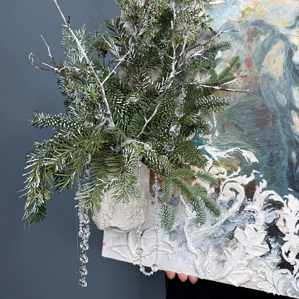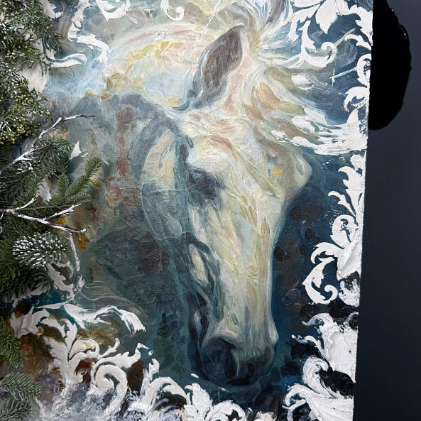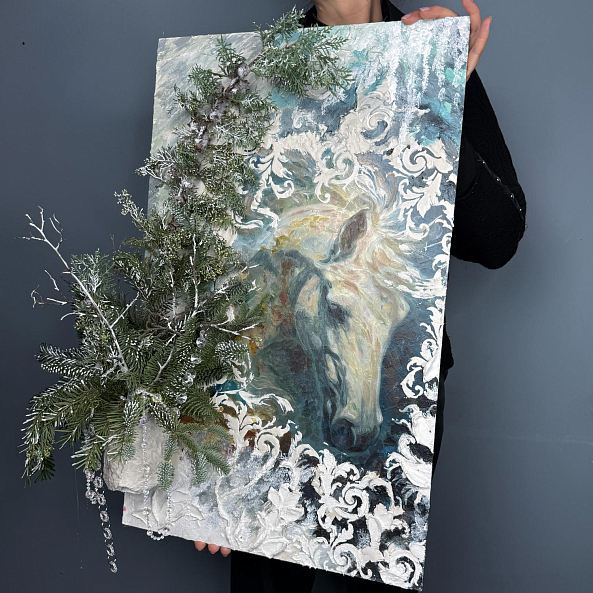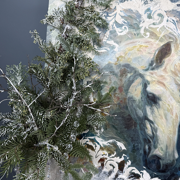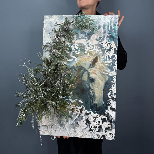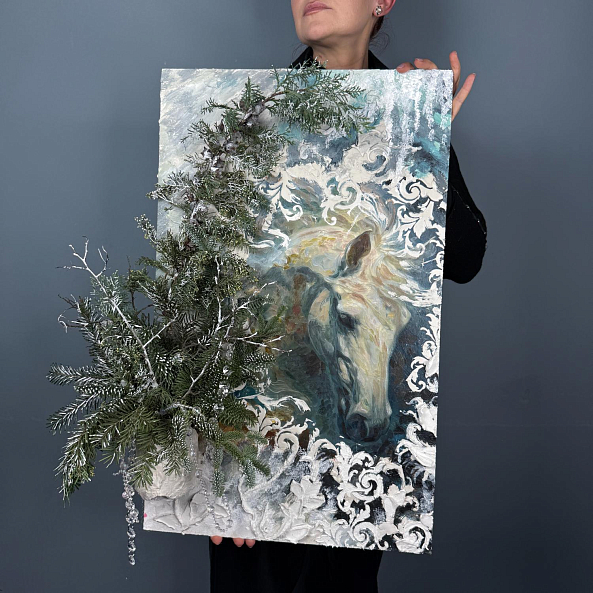 Картина с изображением белой лошади, дополненная объёмным декором из хвои и снежных элементов — это не просто украшение, а настоящее произведение искусства. Идеальна для дома, офиса или в качестве подарка.