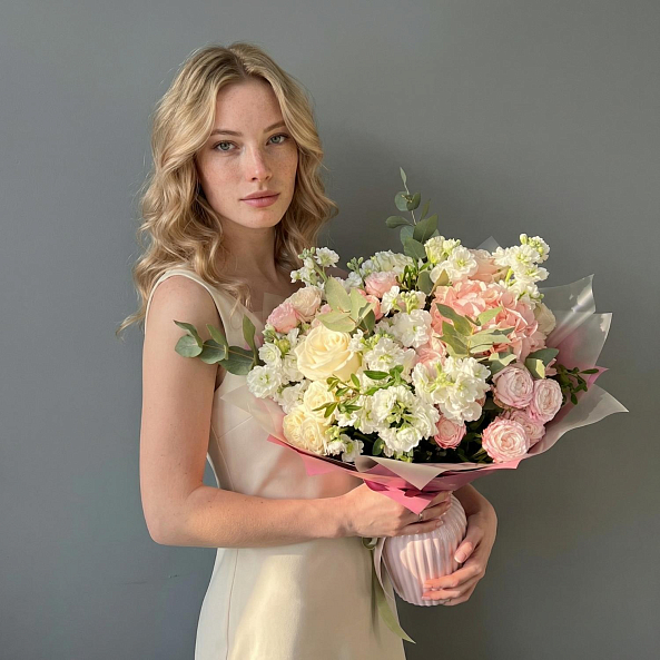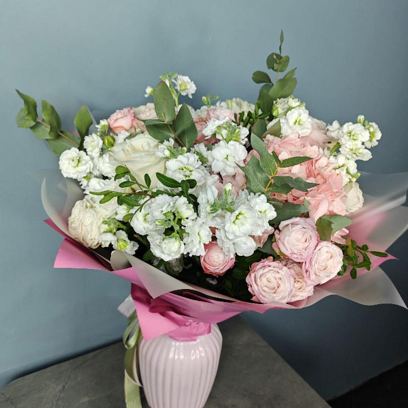 Этот изысканный свадебный букет — нежное переплетение кустовых пионовидных роз, объемных гортензий, ароматной маттиолы и свежего эвкалипта, словно застывший волшебный рассвет в пастельных тонах. Каждый цветок, от пышных бутонов роз с их кремово-розовым оттенком до воздушных соцветий гортензии, дарит ощущение тепла и уюта, а аккуратные ветки эвкалипта придают композиции свежесть и естественную гармонию. Упакованный в персиковую кальку с атласной лентой «RN-Flow», букет выглядит лаконично и стильно, идеально дополняя образ невесты и создавая атмосферу нежности на вашем торжестве.