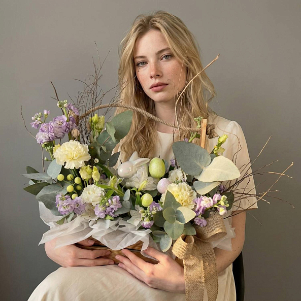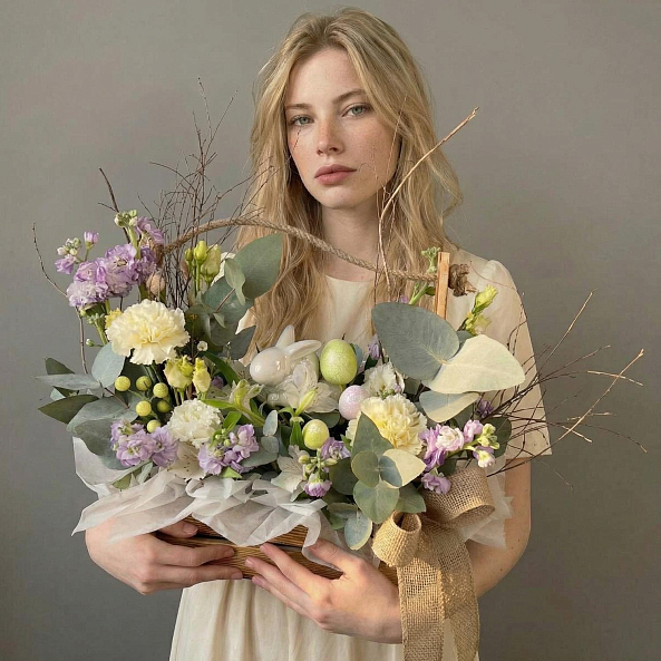 Этот изысканный букет — настоящая симфония весеннего пробуждения, где пастельные оттенки и пасхальные символы сливаются в единый волшебный ансамбль. В корзине из натурального ротанга переплетаются нежные гортензии, ароматные гвоздики, зеленый эвкалипт и декоративные пасхальные яйца, словно застывший момент из сказки. Каждая деталь, от пуховой зайчика до нежных цветов, дарит ощущение тепла и праздничной радости, а аккуратная упаковка с бежевой лентой подчеркивает статус подарка.
