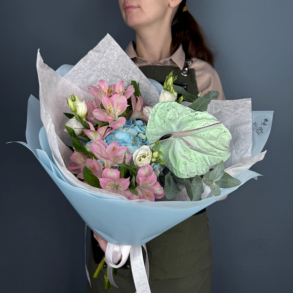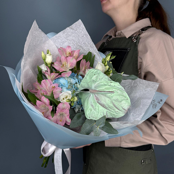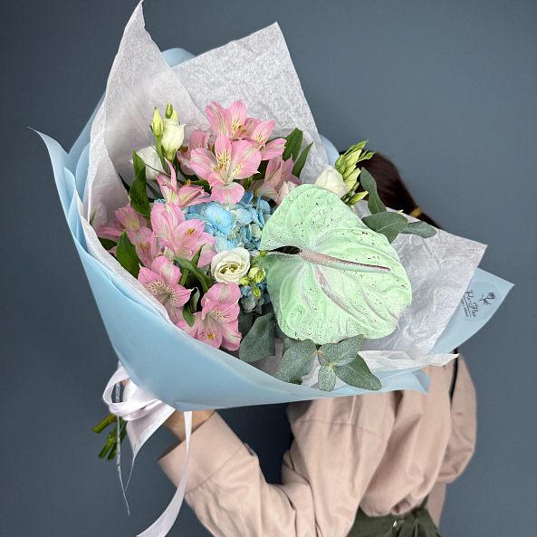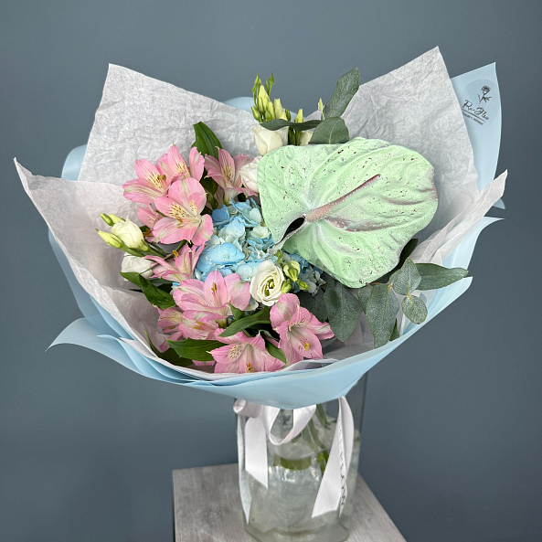 Зелёная антуриум, розовые альстромерии, голубая гортензия и белые эустомы — гармония цвета и текстуры, которая дарит свежесть и спокойствие.