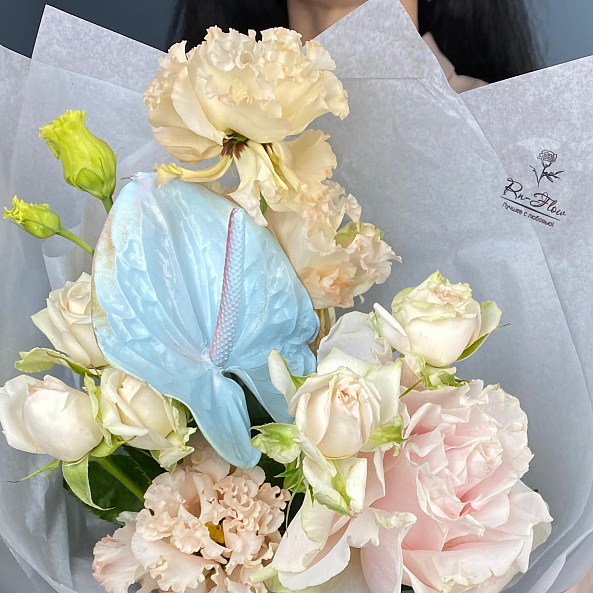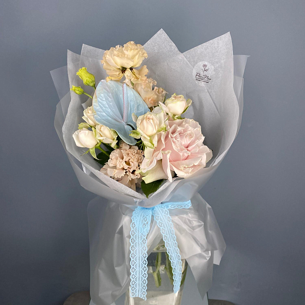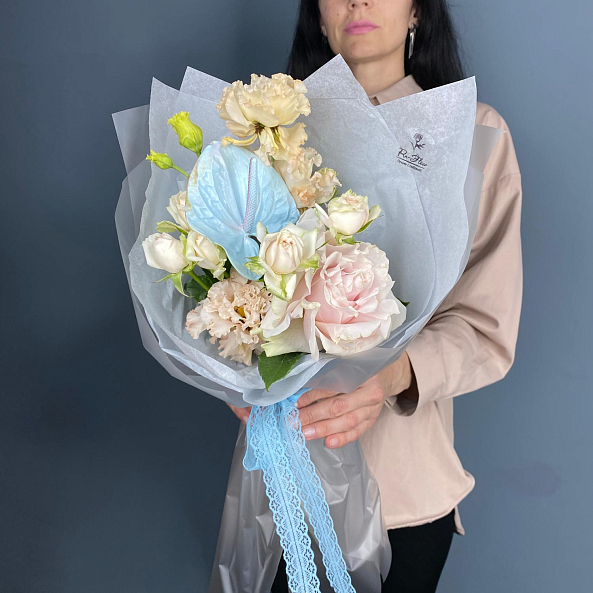 Сочетание нежных розовых роз, пышной эустомы и изысканного голубого антуриума — создают утончённый, воздушный образ. Лёгкая пастель, ажурная лента и свежая зелень придают композиции романтичности и элегантности. Идеален для подарка маме, подруге или на особенный день — когда хочется сказать: *«Ты — моя нежность»*.