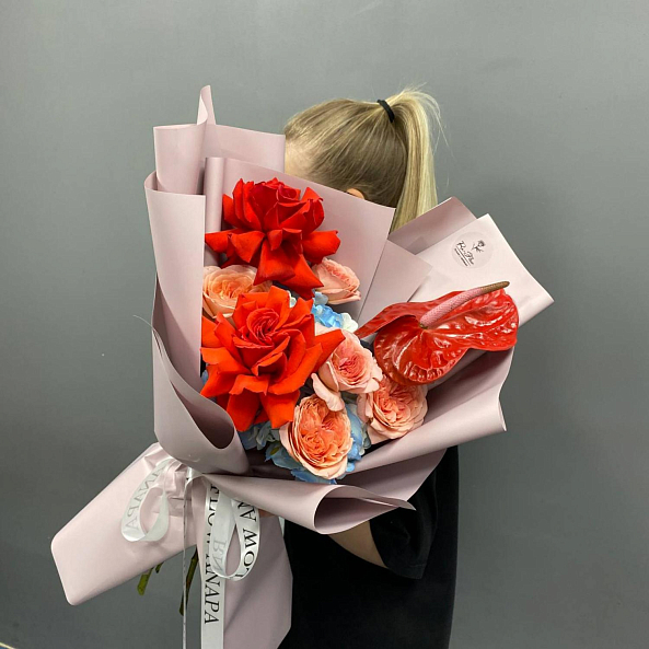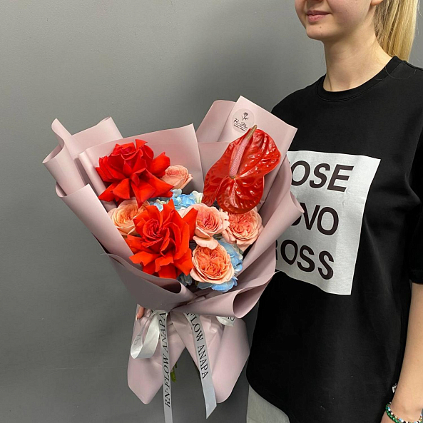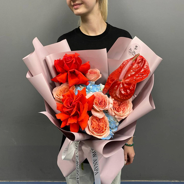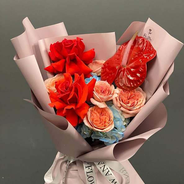 Элегантный и контрастный букет: яркие красные антуриумы и роскошные розы «Нина» сочетаются с нежными пионовидными розами «Лондон Ай» и воздушной голубой гортензией. Композиция выглядит насыщенно, но гармонично — идеальный выбор для тех, кто ценит смелые цвета и изысканную форму.