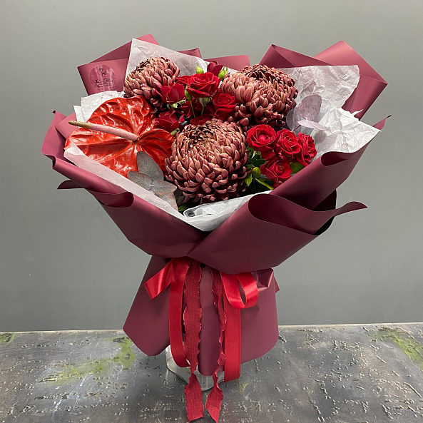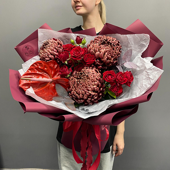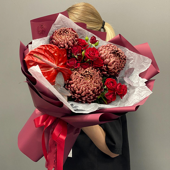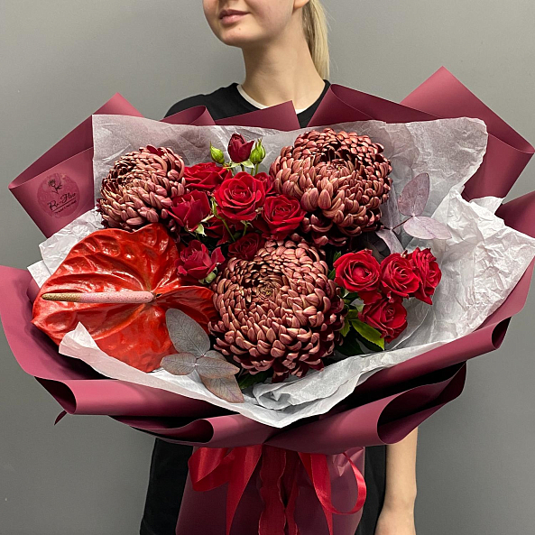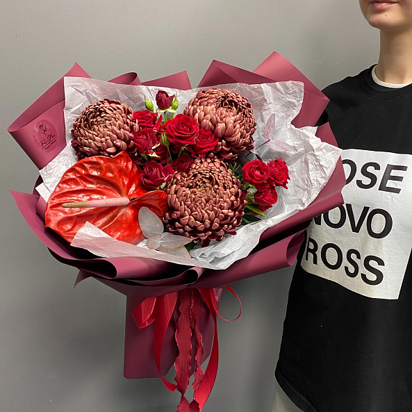 Яркая антуриум, пышные бордовые хризантемы и классические красные розы — это букет для тех, кто ценит роскошь, силу и нежность одновременно.