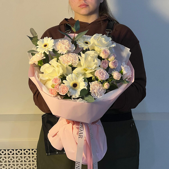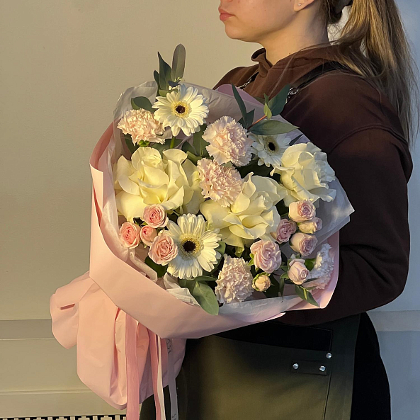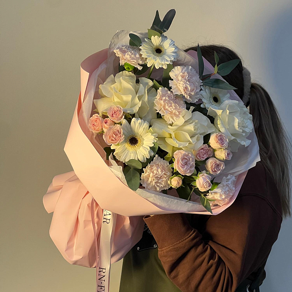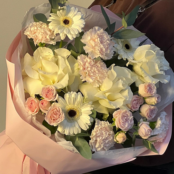 Букет цветов. Французская Белая Роза "Мондиаль", Гербера Белая, Пионовидная Кустовая Роза "Мадам Бомбастик", Гвоздика (Диантус), Эвкалипт.