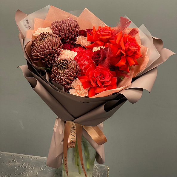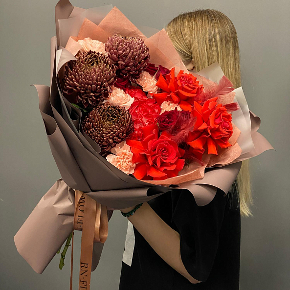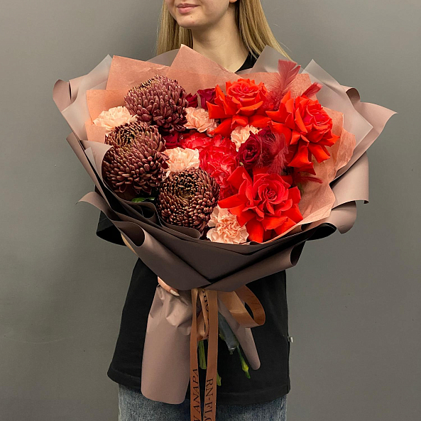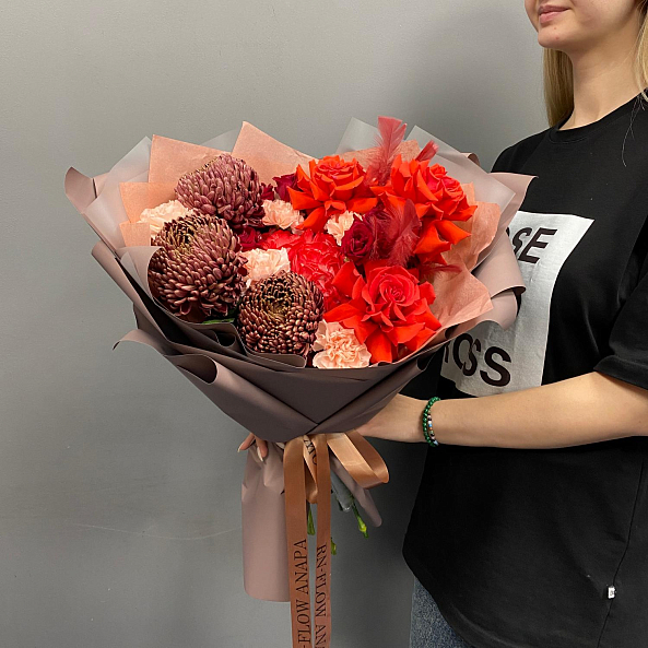 Страстный и насыщенный букет, где яркие красные розы и гвоздики гармонично сочетаются с темно-бордовыми хризантемами. Дополнен перьями для изысканности — идеальный выбор для тех, кто хочет выразить глубокие, сильные чувства.