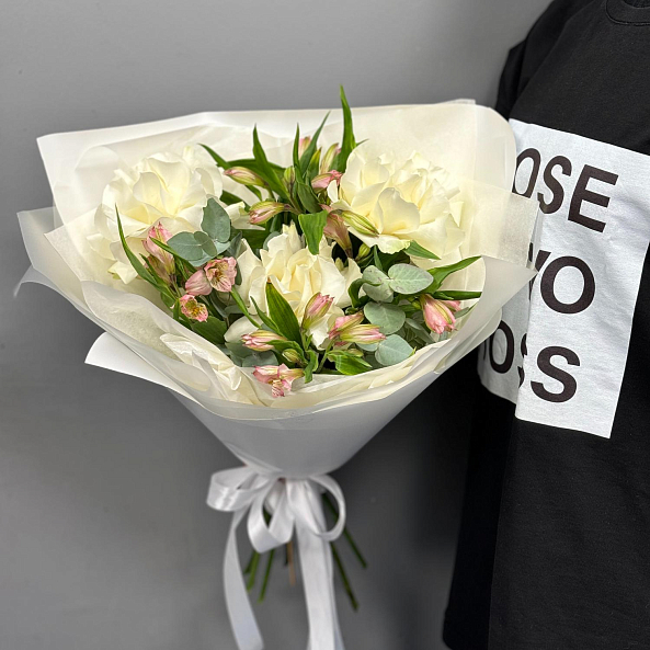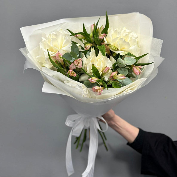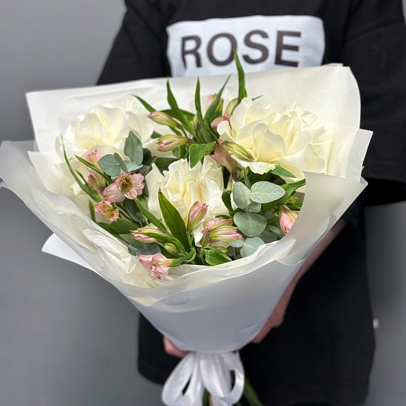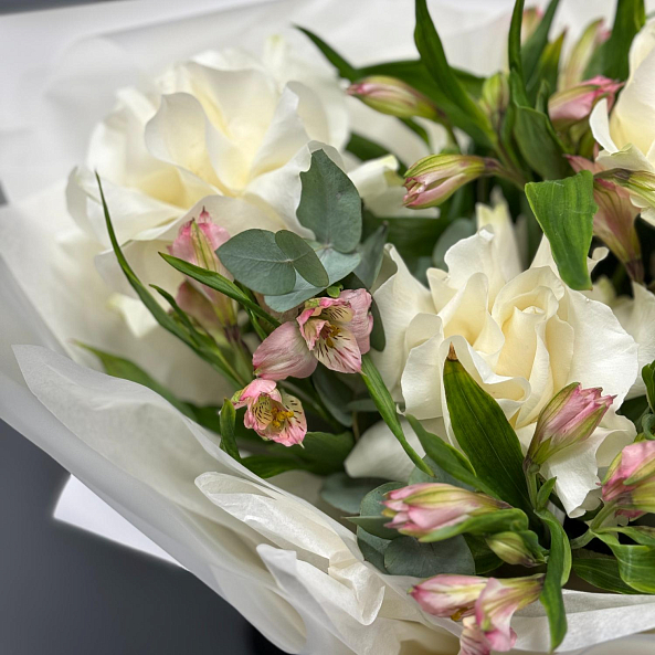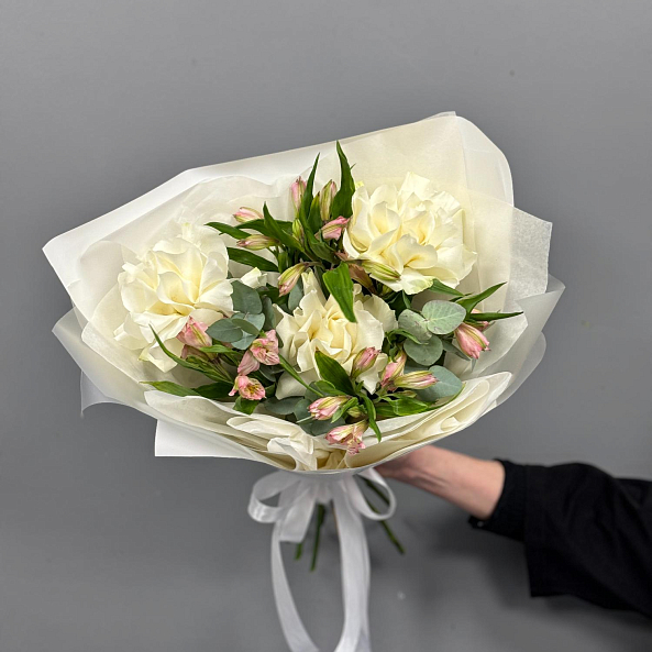 Погрузитесь в атмосферу утонченной простоты с этим изысканным букетом, где нежные белые розы в сочетании с розовыми альстромериями и свежими листьями эвкалипта создают образ, напоминающий рассвет над тихим озером. Каждый лепесток, словно вышитый светом, излучает чистоту и гармонию, а аккуратная упаковка в белую бумагу с атласной лентой подчеркивает лаконичную элегантность композиции.
