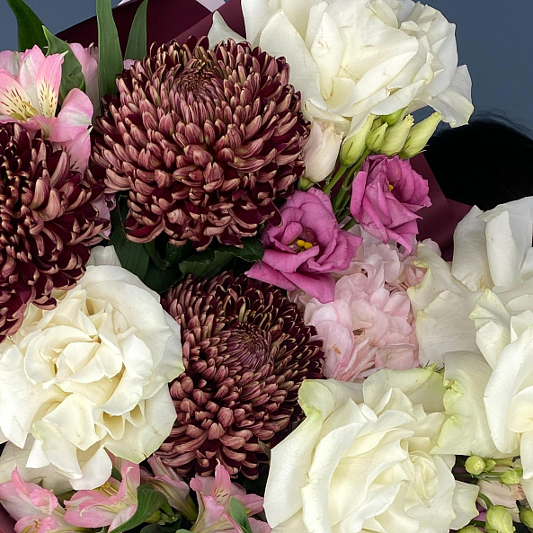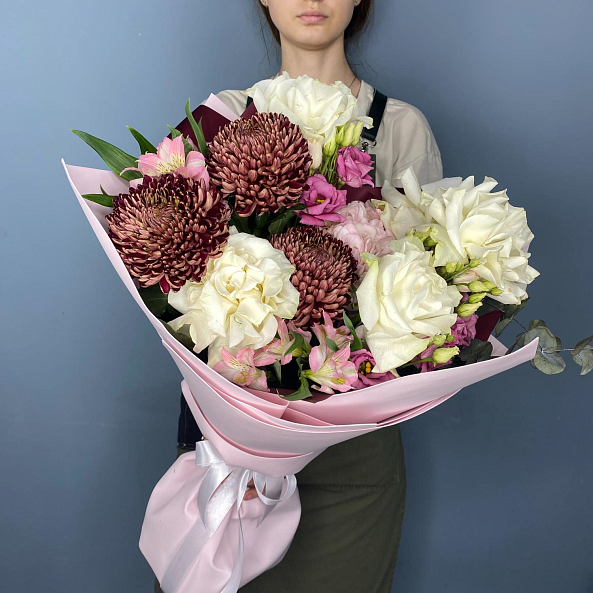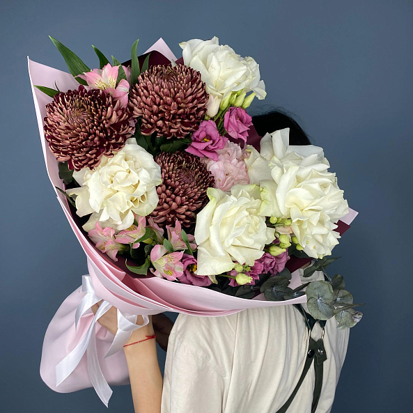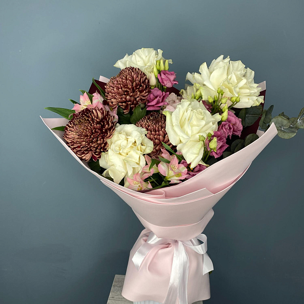 Роскошный и нежный букет в пастельной упаковке. Сочетает крупные белые розы "Мондиаль", пышные коричневые хризантемы "Бигуди", нежную розовую эустому, изящную розовую альстромерию, объемную нежно-розовую гортензию и свежий эвкалипт. Идеален для романтического или торжественного подарка — сочетание элегантности и природной красоты.