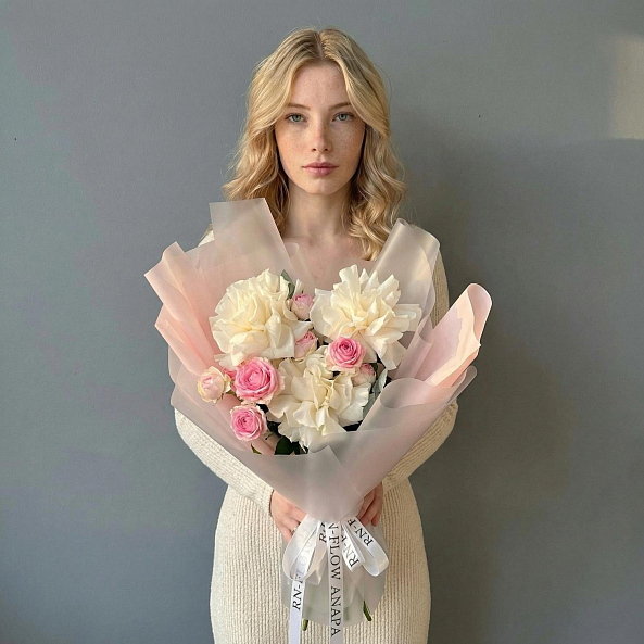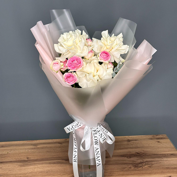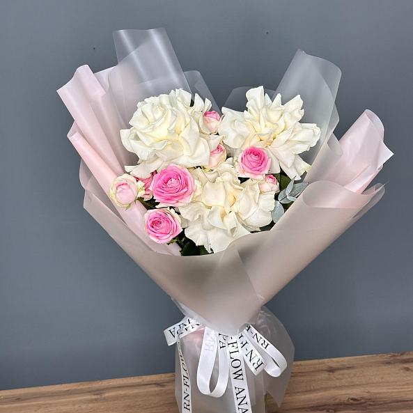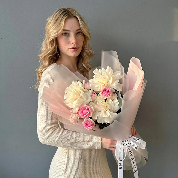 Погрузитесь в атмосферу утонченной романтики с этим изысканным букетом, где пышные белые розы в оттенке слоновой кости плавно сливаются с нежными розовыми цветами, создавая ощущение, будто вы держите в руках кусочек весеннего заката. Каждый лепесток, словно кисть художника, прописан в мягких переходах от чистоты белого к теплу розового, а аккуратная упаковка в светлую розовую и белую бумагу с лентой «RN-FLOW» подчеркивает изысканность композиции.
