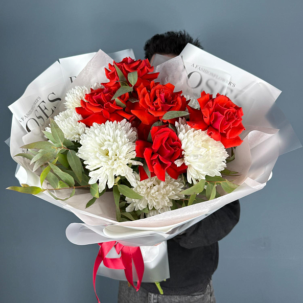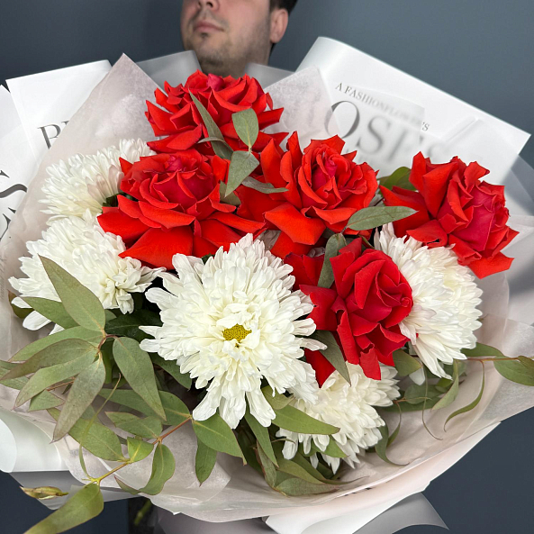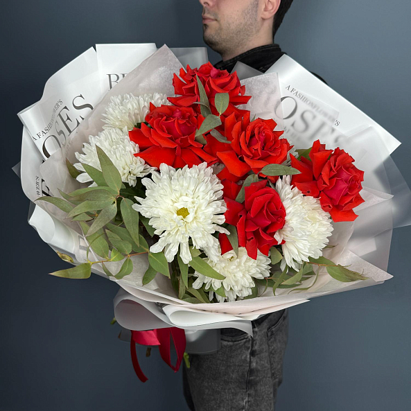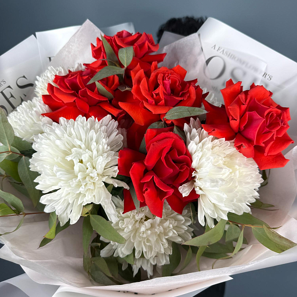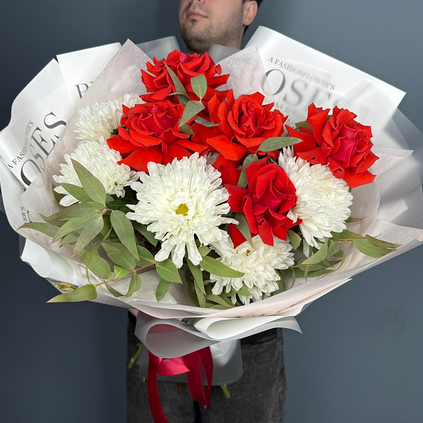 Стильный и выразительный букет, в котором гармонично сочетаются глубокие красные бутоны французской розы «Нина» и пышные белые хризантемы «Антонов». Контраст ярких цветов подчеркнут свежей зеленью эвкалипта, придающей композиции легкость и естественность. Упаковка в дизайнерскую бумагу с логотипом и аккуратная лента завершают образ — это идеальный подарок для тех, кто ценит классику с современным шиком.