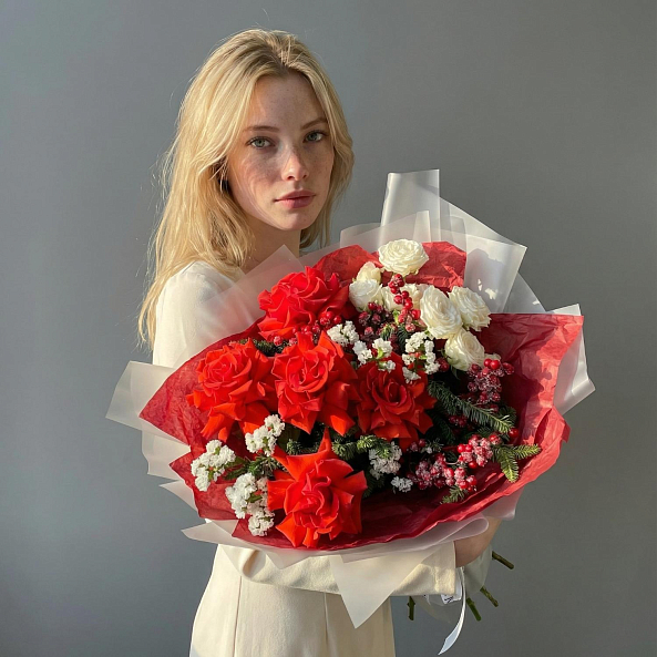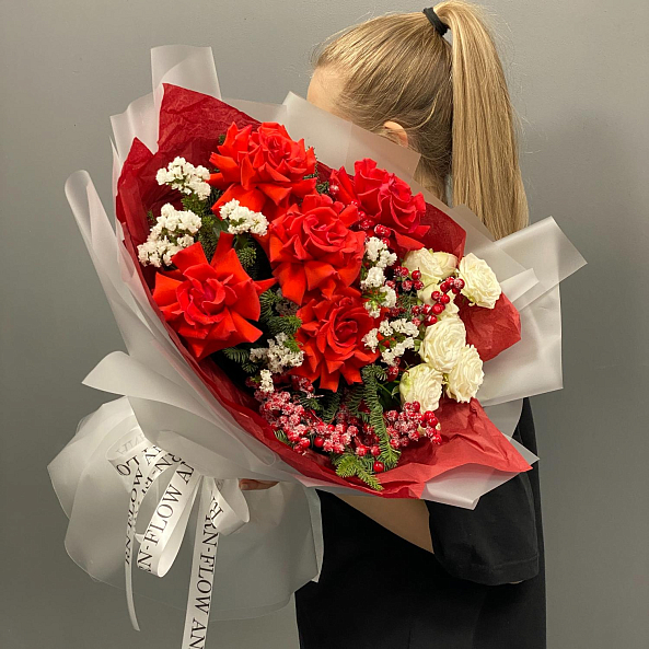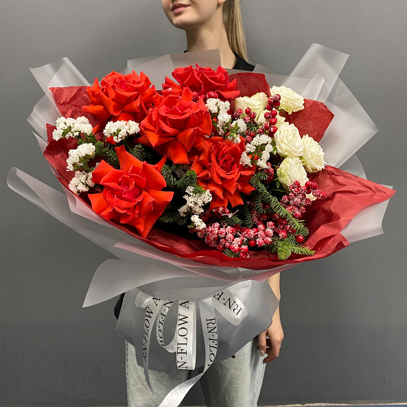 Букет цветов. Французская Роза "Нина", Кустовая Пионовидная Роза "Вайт Пиони", Статица Белая, Нобилис.